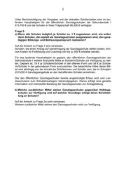 2 Unter Berücksichtigung der Vorgaben und der aktuellen Schülerzahlen sind im lau- fenden Haushaltsjahr für die öffentlichen Ganztagsschulen der Sekundarstufe I 913.700 € und die Schulen in freier Trägerschaft 86.300 € verfügbar. Frage 2: a) Wenn alle Schulen lediglich je Schüler ca. 1 € zugewiesen wird, wie sollen dann Schulen, die explizit als Ganztagsschulen ausgewiesen sind, den ganz- tägigen Bildungs- und Betreuungsanspruch realisieren? Auf die Antwort zu Frage 1 wird verwiesen. Schulen, die einen Antrag auf Genehmigung als Ganztagsschule stellen wollen, kön- nen Kosten für Fortbildung und Coaching von bis zu 500 € erstattet werden. Für das laufende Haushaltsjahr ist geplant, den öffentlichen Ganztagsschulen der Sekundarstufe I weitere finanzielle Mittel je Schülerin/Schüler zur Verfügung zu stel- len. Geplant ist, 19 € je Schülerin/Schüler in der offenen Form und 38 € je Schüle- rin/Schüler in der gebundenen Form auszureichen. Die tatsächliche Höhe dieser Mit- tel wird abhängig von der Anzahl der Schülerinnen und Schüler sein, die im Schuljahr 2013/2014 Ganztagsangebote an den betreffenden Schulen annehmen. Der den öffentlichen Ganztagsschulen bereits angekündigte Erlass wird vom Lan- desschulamt zum Schuljahresbeginn bekanntgegeben. Hierzu erfolgt eine gezielte Information und individuelle Beratung der Ganztagsschulen zur Antragstellung. b) Welche zusätzlichen Mittel stehen Ganztagsschulen gegenüber Halbtags- schulen zur Verfügung und auf welcher Grundlage erfolgt deren Bereitstel- lung an Schulen? Auf die Antwort zu Frage 2a) wird verwiesen. Weitere zusätzliche Mittel stehen den Ganztagsschulen nicht zur Verfügung.