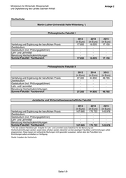 Ministerium für Wirtschaft, Wissenschaft Anlage 2 und Digitalisierung des Landes Sachsen-Anhalt Hochschule: Martin-Luther-Universität Halle-Wittenberg *) Philosophische Fakultät I 2013 2014 2015 (in Euro) (in Euro) (in Euro) Vertiefung und Ergänzung der beruflichen Praxis 17.850 18.025 17.150 Zweitstudium - - - Gaststudium (incl. Prüfungsgebühren) - - - Lehr- und Lernmittel - - - Benutzung Hochschuleinrichtungen - - - Summe Fakultät / Fachbereich 17.850 18.025 17.150 Philosophische Fakultät II 2013 2014 2015 (in Euro) (in Euro) (in Euro) Vertiefung und Ergänzung der beruflichen Praxis 37.300 44.650 49.765 Zweitstudium - - - Gaststudium (incl. Prüfungsgebühren) - - - Lehr- und Lernmittel - - - Benutzung Hochschuleinrichtungen - - - Summe Fakultät / Fachbereich 37.300 44.650 49.765 Juristische und Wirtschaftswissenschaftliche Fakultät 2013 2014 2015 (in Euro) (in Euro) (in Euro) Vertiefung und Ergänzung der beruflichen Praxis 167.685 175.722 145.976 Zweitstudium - - - Gaststudium (incl. Prüfungsgebühren) - - - Lehr- und Lernmittel - - - Benutzung Hochschuleinrichtungen - - - Summe Fakultät / Fachbereich 167.685 175.722 145.976 *) Für die anderen Fakultären gilt: Entgelte für Lehr- und Lernmittel sowie Gebühren für die Benutzung von Hochschuleinrichtungen werden, soweit diese erhoben werden, dezentral von den jeweiligen Fakultäten und Einrichtungen selbst eingenommen. Diese lassen sich anhand der Buchungen nicht gesondert ausweisen, stehen aber den Fakultäten bzw. Einrichtungen selbst unmittelbar zur Verfügung. Quelle: Angaben der Hochschule Seite 1/9