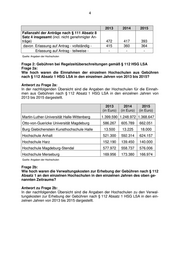 4 2013 2014 2015 Fallanzahl der Anträge nach § 111 Absatz 8 Satz 4 insgesamt (incl. nicht genehmigter An- träge) 472 417 393 davon Erlassung auf Antrag - vollständig - 415 360 364 Erlassung auf Antrag - teilweise - - - - Quelle: Angaben der Hochschulen Frage 2: Gebühren bei Regelzeitüberschreitungen gemäß § 112 HSG LSA Frage 2a: Wie hoch waren die Einnahmen der einzelnen Hochschulen aus Gebühren nach § 112 Absatz 1 HSG LSA in den einzelnen Jahren von 2013 bis 2015? Antwort zu Frage 2a: In der nachfolgenden Übersicht sind die Angaben der Hochschulen für die Einnah- men aus Gebühren nach § 112 Absatz 1 HSG LSA in den einzelnen Jahren von 2013 bis 2015 dargestellt. 2013 2014 2015 (in Euro) (in Euro) (in Euro) Martin-Luther-Universität Halle-Wittenberg 1.399.590 1.248.972 1.368.647 Otto-von-Guericke Universität Magdeburg 586.267 605.789 662.051 Burg Giebichenstein Kunsthochschule Halle 13.500 13.225 18.000 Hochschule Anhalt 521.300 592.314 624.157 Hochschule Harz 152.190 139.450 140.000 Hochschule Magdeburg-Stendal 577.972 558.737 576.006 Hochschule Merseburg 169.956 173.380 166.974 Quelle: Angaben der Hochschulen Frage 2b: Wie hoch waren die Verwaltungskosten zur Erhebung der Gebühren nach § 112 Absatz 1 an den einzelnen Hochschulen in den einzelnen Jahren des oben ge- nannten Zeitraums? Antwort zu Frage 2b: In der nachfolgenden Übersicht sind die Angaben der Hochschulen zu den Verwal- tungskosten zur Erhebung der Gebühren nach § 112 Absatz 1 HSG LSA in den ein- zelnen Jahren von 2013 bis 2015 dargestellt.
