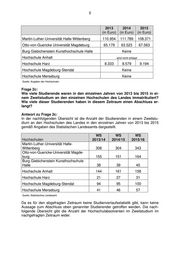 5 2013 2014 2015 (in Euro) (in Euro) (in Euro) Martin-Luther-Universität Halle-Wittenberg 110.954 111.789 108.371 Otto-von-Guericke Universität Magdeburg 65.179 63.523 67.563 Burg Giebichenstein Kunsthochschule Halle Keine Hochschule Anhalt wird nicht erfasst Hochschule Harz 8.333 8.579 9.194 Hochschule Magdeburg-Stendal Keine Hochschule Merseburg Keine Quelle: Angaben der Hochschulen Frage 2c: Wie viele Studierende waren in den einzelnen Jahren von 2013 bis 2015 in ei- nem Zweitstudium an den einzelnen Hochschulen des Landes immatrikuliert? Wie viele dieser Studierenden haben in diesem Zeitraum einen Abschluss er- langt? Antwort zu Frage 2c: In der nachfolgenden Übersicht ist die Anzahl der Studierenden in einem Zweitstu- dium an den Hochschulen des Landes in den einzelnen Jahren von 2013 bis 2015 gemäß Angaben des Statistischen Landesamts dargestellt. WS WS WS Hochschulen 2013/14 2014/15 2015/16 Martin-Luther-Universität Halle- Wittenberg 308 304 343 Otto-von-Guericke-Universität Magde- burg 155 151 164 Burg Giebichenstein Kunsthochschule Halle 38 39 45 Hochschule Anhalt 144 161 158 Hochschule Harz 21 27 31 Hochschule Magdeburg-Stendal 94 95 100 Hochschule Merseburg 41 46 57 Quelle: Statistisches Landesamt Da es für den abgefragten Zeitraum keine Studienverlaufsstatistik gibt, kann keine Aussage zum Abschluss oben genannter Studierender getroffen werden. Die nach- folgende Übersicht gibt die Anzahl der Hochschulabsolventen im Zweitstudium im nachgefragten Zeitraum wider.