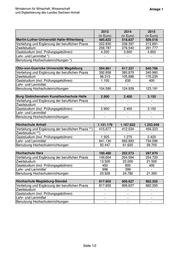 Ministerium für Wirtschaft, Wissenschaft Anlage 1 und Digitalisierung des Landes Sachsen-Anhalt 2013 2014 2015 (in Euro) (in Euro) (in Euro) Martin-Luther-Universität Halle-Wittenberg 485.822 518.837 509.518 Vertiefung und Ergänzung der beruflichen Praxis 222.835 238.397 212.891 Zweitstudium 258.787 276.540 291.777 Gaststudium (incl. Prüfungsgebühren) 4.200 3.900 4.850 Lehr- und Lernmittel *) - - - Benutzung Hochschuleinrichtungen *) - - - Otto-von-Guericke Universität Magdeburg 594.861 617.337 640.786 Vertiefung und Ergänzung der beruflichen Praxis 392.858 385.870 340.960 Zweitstudium 96.313 105.898 176.235 Gaststudium (incl. Prüfungsgebühren) 1.100 630 400 Lehr- und Lernmittel - - - Benutzung Hochschuleinrichtungen 104.590 124.939 123.191 Burg Giebichenstein Kunsthochschule Halle 2.900 2.400 3.150 Vertiefung und Ergänzung der beruflichen Praxis - - - Zweitstudium - - - Gaststudium (incl. Prüfungsgebühren) 2.900 2.400 3.150 Lehr- und Lernmittel - - - Benutzung Hochschuleinrichtungen - - - Hochschule Anhalt 1.151.179 1.167.822 1.253.049 Vertiefung und Ergänzung der beruflichen Praxis **) 415.677 412.034 456.323 Zweitstudium **) - - - Gaststudium (incl. Prüfungsgebühren) 1.925 1.275 2.425 Lehr- und Lernmittel 641.130 692.893 734.596 Benutzung Hochschuleinrichtungen 92.447 61.620 59.705 Hochschule Harz 190.480 252.573 297.970 Vertiefung und Ergänzung der beruflichen Praxis 149.604 204.594 254.720 Zweitstudium 13.500 22.000 21.500 Gaststudium (incl. Prüfungsgebühren) 450 800 400 Lehr- und Lernmittel 998 399 - Benutzung Hochschuleinrichtungen 25.928 24.780 21.350 Hochschule Magdeburg-Stendal 817.605 806.627 982.350 Vertiefung und Ergänzung der beruflichen Praxis 817.605 806.627 982.350 Zweitstudium - - - Gaststudium (incl. Prüfungsgebühren) - - - Lehr- und Lernmittel - - - Benutzung Hochschuleinrichtungen - - - Seite 1/2