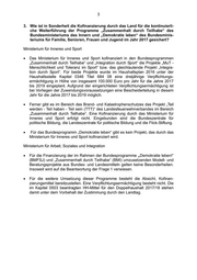3 3. Wie ist in Sonderheit die Kofinanzierung durch das Land für die kontinuierli- che Weiterführung der Programme „Zusammenhalt durch Teilhabe“ des Bundesministeriums des Innern und „Demokratie leben“ des Bundesminis- teriums für Familie, Senioren, Frauen und Jugend im Jahr 2017 gesichert? Ministerium für Inneres und Sport Das Ministerium für Inneres und Sport kofinanziert in den Bundesprogrammen „Zusammenhalt durch Teilhabe“ und „Integration durch Sport“ die Projekte „MuT - Menschlichkeit und Toleranz im Sport“ bzw. das gleichlautende Projekt „Integra- tion durch Sport“. Für beide Projekte wurde im Haushaltsplan 2016 unter der Haushaltsstelle Kapitel 0346 Titel 684 08 eine dreijährige Verpflichtungs- ermächtigung in Höhe von insgesamt 100.000 Euro pro Jahr für die Jahre 2017 bis 2019 eingeplant. Aufgrund der eingerichteten Verpflichtungsermächtigung ist bei Vorliegen der Zuwendungsvoraussetzungen eine Bescheiderteilung in diesem Jahr für die Jahre 2017 bis 2019 möglich. Ferner gibt es im Bereich des Brand- und Katastrophenschutzes das Projekt „Teil werden - Teil haben - Teil sein (TTT)“ des Landesfeuerwehrverbandes im Bereich „Zusammenhalt durch Teilhabe“. Eine Kofinanzierung durch das Ministerium für Inneres und Sport erfolgt nicht. Eingebunden sind die Bundeszentrale für politische Bildung, die Landeszentrale für politische Bildung und die Flick-Stiftung. Für das Bundesprogramm „Demokratie leben“ gibt es kein Projekt, das durch das Ministerium für Inneres und Sport kofinanziert wird. Ministerium für Arbeit, Soziales und Integration Für die Finanzierung der im Rahmen der Bundesprogramme „Demokratie leben!“ (BMFSJ) und „Zusammenhalt durch Teilhabe“ (BMI) umzusetzenden Modell- und Beratungsprojekte aus Bundes- und Landesmitteln gelten keine Besonderheiten. Insoweit wird auf die Beantwortung der Frage 1 verwiesen. Für die weitere Umsetzung dieser Programme besteht die Absicht, Kofinan- zierungsmittel bereitzustellen. Eine Verpflichtungsermächtigung besteht nicht. Die im Kapitel 0503 beantragten HH-Mittel für den Doppelhaushalt 2017/18 stehen damit unter dem Vorbehalt der Zustimmung durch den Landtag.