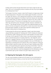 Food Security and the EU’s Common Agricultural Policy (CAP) could be used to protect the agricultural sector from import surges are also very weak. Their use is constrained by onerous conditions and they may only be applied for a limited period of time.149 The European Commision, however, claims that EU exports no longer pose a threat for agricultural sectors in the South, since cereals support has been cut since the first major CAP reforms in 1991, implying that the distortion of world market prices would have largely disappeared. According to Commission figures, the intervention price for bread wheat, for instance, declined by 75 percent from 1991 to 2009. The Commission asserts: “EU prices are increasingly driven by world market prices rather than intervention prices. Intervention has been reduced or abolished in all sectors.” But although the level of CAP support has indeed decreased over the 150 years, EU farmers and exporters still benefit from market instruments (intervention buying and export subsidies), as well as direct payments enabling exports of European wheat products at dumping prices. To demonstrate the still enormous magnitude of support, agricultural analyst Jacques Berthelot calculated the “dumping rate” of all EU cereals and cereal prod- ucts exported in 2006, measured as the ratio of total subsidies to the export value. In that year, the EU exported 27 million tonnes of raw and processed cereals as well as cereal-derived products (including wheat flour, malt, feedstuffs, starch, breads, etc.), equaling 10 percent of its total cereal production. The cereal exports had a value of €3.58 billion and received subsidies to the tune of €1.96 billion, cor- responding to a dumping rate of 54.7 percent. Only a minor proportion of total sub- sidies provided to exported cereals were made up of export subsidies, about €206 million, with the bulk being direct payments amounting to €1.64 billion. Given the 151 tremendous CAP support still awarded to cereal exporters, it is quite bizarre to claim that market distortions would have disappeared and that developing countries could therefore open up their markets to EU grain traders without any risks. 4.3 Opening the flood gates: EU milk exports The vast cereal subsidies provided by the EU benefit not only cereal exporters but also the EU livestock industry, as more than half of EU cereal production 149 �������������������������������������������������������������������������������������������� Oxfam, ‘Oxfam International Concerns with Initialled ‘Interim EPA’ texts’, 7 December 2007. 150 ���������������������� European Commission, The EU’s Common Agricultural Policy (CAP): on the move in a changing world – How the EU’s agriculture and development policies fit together, Luxembourg 2010, p. 12. 151 ������������������������������������������������������������������������������������������������� Jacques Berthelot, ‘The dumping rate of the EU-27 exported cereals in 2006’, Solidarité, 17 May 2010. 53