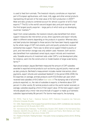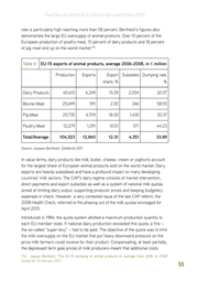 Food Security and the EU’s Common Agricultural Policy (CAP) rate is particularly high reaching more than 58 percent. Berthelot’s figures also demonstrate the large EU oversupply of animal products. Over 10 percent of the European production of poultry meat, 15 percent of dairy products and 18 percent of pig meat end up on the world market.156 Table 6 EU-15 exports of animal products, average 2006-2008, in € million Production Exports Export Subsidies Dumping rate, share, % % Dairy Products 40,610 6,249 15.39 2,004 32.07 Bovine Meat 25,699 591 2.30 346 58.55 Pig Meat 25,735 4,709 18.30 1,430 30.37 Poultry Meat 12,279 1,291 10.51 571 44.23 Total/Average 104,323 12,840 12.31 4,351 33.89 Source: Jacques Berthelot, Solidarité 2011 In value terms, dairy products like milk, butter, cheese, cream or yoghurts account for the largest share of European animal products sold on the world market. Dairy exports are heavily subsidised and have a profound impact on many developing countries’ milk sectors. The CAP’s dairy regime consists of market intervention, direct payments and export subsidies as well as a system of national milk quotas aimed at limiting dairy output, supporting producer prices and keeping budgetary expenses in check. However, a very contested issue of the last CAP reform, the 2008 Health Check, referred to the phasing out of the milk quotas envisaged for April 2015. Introduced in 1984, the quota system allotted a maximum production quantity to each EU member state. If national dairy production exceeded this quota, a fine – the so-called “super-levy” – had to be paid. The objective of the quota was to limit the milk oversupply on the EU market that put heavy downward pressure on the price milk farmers could receive for their product. Compensating, at least partially, the depressed farm gate prices of milk producers meant that additional costs 156 ���������������������������������������������������������������������������������������� Jaques Berthelot, ‘The EU-15 dumping of animal products on average from 2006 to 2008’, Solidarité, 15 February 2011. 55
