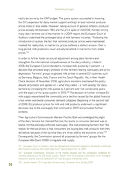 Globalising Hunger had to be borne by the CAP budget. The quota system succeeded in lowering the EU’s expenses for dairy market support and kept at least nominal producer prices more or less stable. However, taking account of general inflation, producer prices actually fell between 1984 and the price spike of 2007/08, thereby forcing many dairy farmers out of the market. In a 2009 report, the European Court of Auditors underlined the prolonged drop of milk farmers’ incomes: “Following the introduction of quotas, the fact that nominal producer prices were maintained masked the reality that, in real terms, prices suffered a distinct erosion. Over a long period, milk producers never actually benefited in real terms from stable prices.”157 In order to further foster structural adjustment among dairy farmers and strengthen the international competitiveness of the dairy industry, in March 2008, the European Council decided to increase milk quotas by 2 percent – a decision that provoked angry protests of milk farmers fearing oversupply and price depression. Farmers’ groups organised milk strikes in several EU countries such as Germany, Belgium, Italy, France and the Czech Republic. Yet, in their Health Check decision of November 2008, agriculture ministers maintained this policy despite all protests and agreed on – what they called – a “soft landing” for dairy farmers by increasing the milk quotas by 1 percent over five consecutive years until the expiry of the quota system in 2015.158 The decision to further increase EU milk supply exacerbated the commodity price decline caused by the global financial crisis when worldwide consumer demand collapsed. Beginning in the second half of 2008, EU producer prices for milk and milk products underwent a significant decrease due to the oversupply that continued in 2009 and provoked further protests. Then Agriculture Commissioner Mariann Fischer Boel acknowledged the plight of the dairy farmers but claimed that only the slump in consumer demand was to blame, not the politically enforced oversupply. She told protesting farmers that “the reason for the low prices is that consumers are buying less milk products than they did before, because of the fact that they are hit as well by the economic crisis.” 159 Consequently, the Commission ignored all proposals by farmers’ groups like the European Milk Board (EMB) to regulate milk supply. 157 European Court of Auditors, Have the Management Instruments Applied to the Market in Milk and Milk Products Achieved Their Main Objectives?, Special Report No. 14, 2009. 158 ������������������������������������������������������������������������������������������� European Commission, ‘Evolution of the market situation and the consequent conditions for smoothly phasing out the milk quota system’, Report from the European Commission to the European Parliament and the Council, COM(2010) 727 final, Brussels, 8 December 2010. 159 Jennifer Rankin, ‘EU to pay dairy farmers early’, European Voice, 26 May 2009. 56