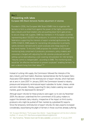 Food Security and the EU’s Common Agricultural Policy (CAP) Box 3 Preventing milk lakes European Milk Board demands flexible adjustment of volumes Founded in 2006, the European Milk Board (EMB) tries to organise milk farmers to form a united front against the power of the highly concentrated dairy industry and food retailers who are pushing down farm-gate prices to secure cheap milk supplies. EMB has members in 14 European countries representing about 100,000 milk producers. In contrast to traditional farmers federations supporting the interests of export-oriented agribusiness like COPA-COGECA, EMB pleads for reorienting milk production to primarily satisfy domestic demand and to avoid surpluses and cheap exports on the world market. To this end, EMB proposes the creation of a European monitoring body comprised of producers, processors, policy-makers and consumers charged with adjusting the milk volumes produced and with setting a price band allowing a cost-covering remuneration for milk farmers. “Volume control is indispensable”, according to EMB. The monitoring body would be “an effective mechanism to prevent surpluses” enabling farmers “to earn a decent living from their labour”.160 Instead of curbing milk supply, the Commission followed the interests of the dairy industry and food traders. Business representatives like the European Dairy Association EDA lobbied for the reintroduction of export refunds, which had been set at zero in June 2007. In January 2009, the Commission bowed to industry pressure and temporarily reintroduced export subsidies for butter, cheese, whole and skim milk powder, thereby supporting EU dairy traders seeking new export markets, given the depressed EU demand. 161 Although export refunds for these products were again cut to zero by November 2009, this decision underlined the firm commitment of EU policy-makers to support the domestic dairy industry, irrespective of the impact on third country producers who might be pushed off their markets by subsidised EU exports. Since the temporary reintroduction of export refunds, EU dairy exports increased considerably, exacerbating the plight of farmers in those countries already suffering 160 European Milk Board, ‘The European Dairy Market – Supply Management with the Aid of a Monitor- ing Body’, 21 January 2011. http://www.europeanmilkboard.org/emb.html 161 ����������������������������������������������������������� Katy Humphries, ‘����������������������������������������� ������������������������������������������ Tensions mount over EU dairy subsidies’, just-food.com, 19 January 2009. 57