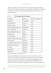 Globalising Hunger “Peak”), condensed and evaporated milk by FrieslandCampina (“Bonnet Rouge”, “Three Crowns”), butter and cheese by Lactalis (“Bridel”, “Président”) and Parmalat (“Parmalat”, “Bonnita”) as well as yoghurts by Groupe Danone (“Danone”) and Sodiaal (“Yoplait”).172 Table 7 Top European Dairy Processors Company Country Turnover, in billion € Nestlé S.A. Switzerland 16.9 Groupe Danone France 9.2 Groupe Lactalis France 9.2 Royal FrieslandCampina N.V. Netherlands 9.1 Arla Foods amba Denmark 6.4 Parmalat Finanziaria S.p.A. Italy 3.6 Bongrain S.A. France 3.4 Groupe Sodiaal France 2.8 Dairy Farmers of America Inc. USA 2.3 Nordmilch AG Germany 2.3 Theo Müller GmbH & Co. KG. Germany 2.2 Humana Milchunion e.G. Germany 2.2 Tine BA Norway 2.0 Groupe Bel France 2.0 Glanbia plc Ireland 1.8 Source: Baking + Biscuit, Issue 4, 2009, p. 32 The sales of European dairy products in African countries are also closely linked to the expansion of supermarkets advancing not only in urban centres but also in rural areas. In Cameroon, e.g., supermarkets opening up in rural areas and offering tins of European milk powder and condensed milk have effectively undermined attempts to establish a market for locally produced fresh 172 ��������������������������������������������������������������������������������������������������� ACDIC (Association citoyenne de défense des intérêts collectifs), ‘Filière laitière au Cameroun’, Collectif Alimenterre (CFSI, SOS Faim), June 2006. Maurice Oudet, ‘La révolution blanche est-elle possible au Burkina Faso, et plus largement en Afrique de l’Ouest?’, Misereor, July 2005, Aachen. 60