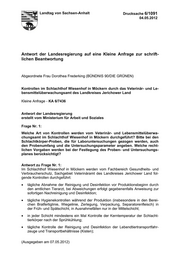 Landtag von Sachsen-Anhalt Drucksache 6/1091 04.05.2012 Antwort der Landesregierung auf eine Kleine Anfrage zur schrift- lichen Beantwortung Abgeordnete Frau Dorothea Frederking (BÜNDNIS 90/DIE GRÜNEN) Kontrollen im Schlachthof Wiesenhof in Möckern durch das Veterinär- und Le- bensmittelüberwachungsamt des Landkreises Jerichower Land Kleine Anfrage - KA 6/7436 Antwort der Landesregierung erstellt vom Ministerium für Arbeit und Soziales Frage Nr. 1: Welche Art von Kontrollen werden vom Veterinär- und Lebensmittelüberwa- chungsamt im Schlachthof Wiesenhof in Möckern durchgeführt? Bitte bei den Schlachtkörper-Proben, die für Laboruntersuchungen gezogen werden, auch den Probenumfang und die Untersuchungsparameter angeben. Welche recht- lichen Vorgaben werden bei der Festlegung des Proben- und Untersuchungs- planes berücksichtigt? Antwort zu Frage Nr. 1: Im Schlachthof Wiesenhof in Möckern werden vom Fachbereich Gesundheits- und Verbraucherschutz, Sachgebiet Veterinäramt des Landkreises Jerichower Land fol- gende Kontrollen durchgeführt: • tägliche Abnahme der Reinigung und Desinfektion vor Produktionsbeginn durch den amtlichen Tierarzt, bei Abweichungen erfolgt gegebenenfalls Anweisung zur sofortigen Nachreinigung und Desinfektion; • tägliche Hygienekontrollen während der Produktion (insbesondere in den Berei- chen Bratfertiglinie, Wiegelinie, Zerlegung, Verpackung, Separatorenfleisch) in der Früh- und Spätschicht, in Ausnahmefällen nur in der Mittelschicht; • in jeder Schicht mindestens ein Mal Kontrolle der Kerntemperatur der Schlacht- tierkörper nach der Sprühkühlung; • tägliche Kontrolle der Reinigung und Desinfektion der Lebendtiertransportfahr- zeuge und Transportbehältnisse (Kisten); (Ausgegeben am 07.05.2012)