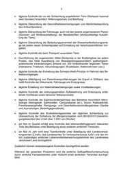2 • tägliche Kontrolle der vor der Schlachtung angelieferten Tiere (Wartezeit maximal zwei Stunden) hinsichtlich Witterungsschutz und Belüftung; • tägliche Überprüfung der Gesundheitsbescheinigungen und Nämlichkeitsprüfung des Schlachtpostens; • tägliche Überprüfung der Fahrzeuge, auch mit den jeweils angemessenen Planen (Sommer- und Winterausstattung), der Besatzdichten (stichpunktartige Auszäh- lung der Tiere); • tägliche Überprüfung der Betäubungsparameter der Wasserbadbetäubungsanla- ge bei jedem neuen Schlachtposten auf Einhaltung der tierschutzrechtlichen Vor- gaben, • tägliche Kontrolle der beim Transport verendeten Tiere; • Durchführung der sogenannten 300er-Stichprobe in der Bratfertiglinie bei jedem Posten, das heißt Auszählung von Beanstandungsparametern (pathologisch- anatomische Veränderungen) anhand von 300 hintereinander folgenden Tieren (Hämatome, Frakturen, Verunreinigungen, Brustblasen, Ballennekrosen usw.); • tägliche Kontrolle der Einhaltung des Schwarz-Weiß-Prinzips im Rahmen des Be- triebsrundganges; • tägliche Abfertigung von Fleischtransportfahrzeugen bei Export in Drittland, das heißt Kontrolle der Dokumente, Fahrzeuge und Erzeugnisse; • tägliche Erstellung von Veterinärbescheinigungen sowie Vorattestierungen; • tägliche Kontrolle der ordnungsgemäßen Aufbewahrung und Entsorgung anfal- lender Konfiskate sowie tierischer Nebenprodukte; • tägliche Kontrolle der Eigenkontrollergebnisse des Betriebes hinsichtlich Mikro- biologie (Keimgehalt, Salmonellen, Campylobacter etc.), Dioxin, Radioaktivität, Fremdwassergehalte, Reinigungs- und Desinfektionskontrollergebnisse (Geräte und Ausrüstungen, Bedarfsgegenstände); • tägliche Kontrolle des Bruttolebendgewichtes der täglichen Schlachtung zur Überwachung der Einhaltung der Mengenvorgaben nach BImSchVO (Genehmi- gungsbescheid des LVwA über 1 200 t pro Woche); • ein Mal im Quartal erfolgt eine Kontrolle des lebensmittelhygienisch relevanten Teils des Betriebes unter Beteiligung eines weiteren amtlichen Tierarztes, • ein Mal im Jahr wird eine Teamkontrolle unter Beteiligung des Landesverwal- tungsamtes (LVwA), des Landesamtes für Verbraucherschutz (LAV) und der ört- lich zuständigen amtlichen Lebensmittelüberwachungsbehörde des Landkreises Jerichower Land durchgeführt. Zusätzlich können anlassbezogene Kontrollen durchgeführt werden. Während der gesamten Produktion wird die amtliche Geflügelfleischuntersuchung durch amtliche Fachassistenten unter Aufsicht eines amtlichen Tierarztes durchge- führt.