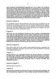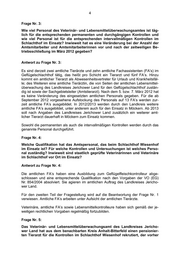 5 beim Landkreis Anhalt-Bitterfeld angestellt war. Ist es üblich, auf Landkreis- ebene einen bereits pensionierten Veterinär zu reaktivieren, um in einem ande- ren Landkreis auszuhelfen? Wie kommt es in dem konkreten Fall dazu, ausge- rechnet diese bereits pensionierte Fachkraft zu reaktivieren? Gab es hierzu keine Alternative? Wurde überhaupt eine Alternative in Betracht gezogen? Wie ist die Indienststellung eines bereits pensionierten Tierarztes rein organisato- risch möglich? Für welche Art von Kontrollen wird dieser Veterinär eingesetzt? Ersetzt dieser Veterinär aus Anhalt-Bitterfeld den/die Veterinär/in, die/der die zeitweilige Betriebsschließung im März 2012 veranlasst hatte? Antwort zu Frage Nr. 5: Der betreffende Tierarzt war kurzfristig (für zwei Tage) und ausschließlich für den Landrat des Landkreises Jerichower Land als externer, fachlicher Berater allgemei- ner Art auf Honorarvertragsbasis und nicht als amtlicher Tierarzt für den Landkreis Jerichower Land tätig. Insofern gab es keine Übernahme von Aufgaben der amtli- chen Tierärzte durch den betreffenden Tierarzt. Frage Nr. 6: Wie lange war der betreffende Tierarzt aus dem Landkreis Anhalt-Bitterfeld nicht mehr als Veterinär tätig? Hat sich dieser Tierarzt seit seiner Pensionie- rung fachlich weitergebildet und sich auf den neusten Stand der wissenschaft- lichen Erkenntnisse gebracht? Welche Nachweise über Fortbildungsmaßnah- men aus den vergangenen 18 Monaten kann der für die Erfüllung der Aufgaben ausgewählte Veterinär beibringen? Welche Kriterien in Bezug auf fachliche Eignung wurden bei der Einsetzung des Veterinärs berücksichtigt? Antwort zu Frage Nr. 6: Dazu liegen weder der für die amtliche Lebensmittelüberwachung zuständigen Be- hörde des Landkreises Jerichower Land noch dem LVwA oder Ministerium für Arbeit und Soziales Kenntnisse vor. Frage Nr. 7: Wie beurteilt der neu eingesetzte Veterinär die aktuelle Situation im Schlacht- hof Wiesenhof in Möckern? Gibt es Unterschiede zwischen dem neuen Veteri- när in der Bewertung der hygienischen Mängel, die vom bisherigen zuständi- gen Veterinär des Landkreises Jerichower Land im Februar und März 2012 festgestellt wurden? Antwort zu Frage Nr. 7: Siehe Antwort zu Frage Nr. 5. Frage Nr. 8: Wie viel Zeit ist gemäß einer EU-Verordnung pro Hähnchen-Schlachtkörper für die Fleischbeschau vorgesehen? Ist es richtig, dass dem Schlachthof Wiesen-