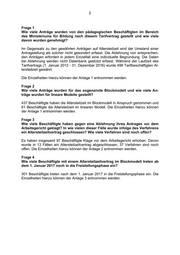 2 Frage 1 Wie viele Anträge wurden von den pädagogischen Beschäftigten im Bereich des Ministeriums für Bildung nach diesem Tarifvertrag gestellt und wie viele davon wurden genehmigt? Im Gegensatz zu den gewährten Anträgen auf Altersteilzeit wird der Umstand einer Antragstellung als solcher nicht gesondert erfasst. Die Ablehnung von entsprechen- den Anträgen erfordert in jedem Einzelfall eine individuelle Begründung. Die Daten bei Ablehnung werden nicht Datenbank gestützt erfasst. Während der Laufzeit des Tarifvertrags (1. Januar 2012 - 31. Dezember 2016) wurde 498 Tarifbeschäftigten Al- tersteilzeit gewährt. Die Einzelheiten hierzu können der Anlage 1 entnommen werden. Frage 2 Wie viele Anträge wurden für das sogenannte Blockmodell und wie viele An- träge wurden für lineare Modelle gestellt? 437 Beschäftigte haben die Altersteilzeit im Blockmodell in Anspruch genommen und 61 Beschäftigte die Altersteilzeit im linearen Modell. Die Einzelheiten hierzu können der Anlage 1 entnommen werden. Frage 3 Wie viele Beschäftigte haben gegen eine Ablehnung ihres Antrages vor dem Arbeitsgericht geklagt? In wie vielen dieser Fälle wurde infolge des Verfahrens ein Altersteilzeitvertrag geschlossen? Wie viele Verfahren sind noch offen? Es haben insgesamt 97 Beschäftigte Klage vor dem Arbeitsgericht erhoben. Davon wurde in 13 Fällen ein Altersteilzeitvertrag abgeschlossen; 37 Verfahren sind noch offen. Die Einzelheiten hierzu können der Anlage 2 entnommen werden. Frage 4 Wie viele Beschäftigte mit einem Altersteilzeitvertrag im Blockmodell treten ab dem 1. Januar 2017 noch in die Freistellungsphase ein? 301 Beschäftigte treten nach dem 1. Januar 2017 in die Freistellungsphase ein. Die Einzelheiten hierzu können der Anlage 3 entnommen werden.