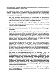 2 tische Motivation (hierunter fallen auch rechtsextremistische, fremdenfeindliche und antisemitische Straftaten) zugrunde liegt. Die aufgeführten Zahlen für den Monat Mai 2015 stellen keine abschließende Sta- tistik dar, sondern können sich aufgrund von Nachmeldungen noch (teilweise sehr deutlich) verändern und haben daher nur vorläufigen Charakter. Die Erhebung erfolg- te mit Stand vom 31. Mai 2015. 1. Wie viele Straftaten - ausgenommen der Gewaltdelikte - im Phänomenbe- reich „Politisch motivierte Kriminalität - rechts“ wurden von der Polizei in Sachsen-Anhalt im Jahr 2015 für den Monat Mai registriert? Für den Monat Mai 2015 wurden in Sachsen-Anhalt 32 politisch motivierte Straftaten registriert, die dem Phänomenbereich Politisch motivierte Kriminalität - rechts - zugeordnet worden sind. 2. Wie viele Nachmeldungen wurden für die Vormonate seit Jahresbeginn registriert? Der Begriff der Nachmeldung ist im Definitionssystem Politisch motivierte Krimi- nalität nicht definiert. Es handelt sich dabei um Straftaten, die nachträglich, d. h. nach einer als Berichtszeitraum definierten Zeitspanne bekannt geworden/ge- meldet worden sind. Das Fallaufkommen der Polizei bekannt gewordener Straf- taten ist im Wesentlichen vom Anzeigeverhalten der Betroffenen abhängig. Darüber hinaus wird die politische Motivation oft erst im Verlauf des Ermitt- lungsverfahrens festgestellt und entsprechend gemeldet. Als Vormonate, bezogen auf den Monat Mai 2015, wurden in diesem Zusam- menhang die Straftaten mit Tatzeit vom 1. Januar 2015 bis einschließlich 30. April 2015 interpretiert, die dem Polizeilichen Staatsschutz ab dem 1. Mai 2015 bekannt wurden und im Rahmen des Kriminalpolizeilichen Meldedienstes in Fällen Politisch motivierter Kriminalität (KPMD-PMK) gemeldet worden sind. Demnach sind in diesem Zeitraum 95 Straftaten der Politisch motivierten Krimi- nalität - rechts - nachträglich registriert worden. 3. Um welche Art von Delikten handelte es sich bei den unter 1. und 2. er- fragten Taten? An welchen Tatorten (Kommune und Angabe Stadt- bzw. Ortsteil) wurden diese Straftaten wann (Datum und Uhrzeit) verübt? Bitte konkrete Auflistung nach Polizeidirektionen und Polizeirevieren, entspre- chend der verletzten Rechtsnorm, Angaben zum Sachverhalt (Tather- gang/Art und Weise), Themenfeldern im Phänomenbereich PMK-rechts (Rassismus, Antisemitismus, gegen links, Konfrontation/politische Ein- stellung, sexuelle Orientierung, etc.), Festnahmen, Untersuchungshaft. Welche dieser Straftaten waren extremistisch ausgeprägt? Welcher mate- rielle Schaden entstand jeweils? Im Landeskriminalamt Sachsen-Anhalt werden keine Statistiken mit Angaben zum Tathergang geführt. In keinem der registrierten Fälle wurde eine Unter- suchungshaft angeordnet.