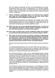 2 feld, der Flughafen Leipzig/Halle, die Elbe und der Mittellandkanal, die landes- bedeutsamen Häfen usw. bieten Transportoptionen und effiziente Logistiklö- sungen in alle Himmelsrichtungen. Vor diesem Hintergrund ist eine Benennung einzelner Städte und Gemeinden nicht zielführend. Hier ist Sachsen-Anhalt im Ganzen zu betrachten. 3. Welche Teilnehmer (vollständige Namen und Institution bzw. Abschrift oder Kopie der Teilnehmerlisten) nahmen an den ersten beiden Hafen- hinterlandkonferenzen in Magdeburg und Halle teil? Da eine Einverständniserklärung der Teilnehmer nicht vorliegt, wird aus daten- schutzrechtlichen Gründen von einer Publikation der Teilnehmerlisten der Ha- fenhinterlandkonferenzen 2013 und 2015 abgesehen. Diese können nach ent- sprechender Verständigung bei der IMG eingesehen werden. 4.a) Haben sich aus den auf den Hafenhinterlandkonferenzen von 2013 und 2015 geknüpften Kontakten konkrete (Folge-) lnvestitionen (Erweiterun- gen oder Neuansiedlungen von Unternehmen) ergeben? 4.b) Falls Frage 4.a bejaht wurde, welche Investitionen (Name des Investors, Art und Anschrift des Unternehmens) und in welchem Umfang in TEUR? 5. Falls Frage 4.a verneint wurde, auf welchen messbaren Erfolgsparame- tern (bitte konkret die wissenschaftliche Bezeichnung/Name des jeweili- gen Parameters aufführen) der Wirtschaftsförderung unter Angabe ih- res Erfüllungs-lstwertes rechtfertigt die Landesregierung das zu hinter- fragende Kosten-Nutzen-Verhältnis dieser Veranstaltungsreihe? Aufgrund ihres Sachzusammenhangs werden die Fragen zusammen beantwor- tet. Die Hafenhinterlandkonferenzen 2013 und 2015 haben das Ziel verfolgt, u. a. das Klima für Investitionen in Sachsen-Anhalt zu verbessern. Dieses Ziel wurde erreicht. Zu konkreten Investitionsentscheidungen (Erweiterungen oder Neuan- siedlungen von Unternehmen) liegen keine Erkenntnisse vor. Die Konferenzen dienten in erster Linie der öffentlichkeitswirksamen Darstel- lung des Logistikstandortes Sachsen-Anhalt. Der inhaltliche Schwerpunkt der Konferenzen lag darin, Sachsen-Anhalts Qualität im Zusammenwirken von Wissenschaft und Wirtschaft zu Themen wie der Förderung von anwendungs- orientierter Forschung, der Optimierung logistischer Schnittstellen sowie multi- modaler und energieeffizienterer Umschlagseinrichtungen zu kommunizieren und Erfolge ausgewählter Referenzprojekte vorzustellen. Mit den Konferenzen sollte die Rolle Sachsen-Anhalts als „Logistikdrehscheibe Mitteldeutschland“ gefestigt werden. Die Konferenzen wurden darüber hinaus genutzt, um die Maßgaben der Regio- nalen Innovationsstrategie des Landes Sachsen-Anhalt vorzustellen und zu kommunizieren sowie dabei den Bogen zur Europa 2020-Strategie zu schlagen, insbesondere im Hinblick auf die Bereiche Innovation, Klimaschutz, Energie und Verkehr.