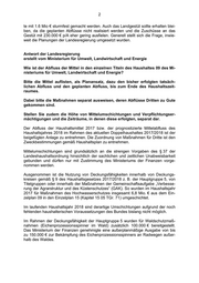 Landtag von Sachsen-Anhalt Drucksache 7/3240 13.08.2018 Antwort der Landesregierung auf eine Kleine Anfrage zur schrift- lichen Beantwortung Abgeordneter Hannes Loth (AfD) Abflüsse aus dem Haushalt im Einzelplan 09 (EP 09) des Ministeriums für Um- welt, Landwirtschaft und Energie - Bereich Landwirtschaft Kleine Anfrage - KA 7/1854 Vorbemerkung des Fragestellenden: Aktuell befinden sich die Landesregierung und die Ministerien in der Phase der Auf- stellung der fachspezifischen Ausgaben der einzelnen Ministerien für den kommen- den Haushalt. Bereits zum letzten Haushaltsplan für die Haushaltsjahre 2017 und 2018 hatte die AfD-Fraktion umfangreiche monetäre Veränderungen im EP 09 vorgeschlagen, von denen kein Vorschlag angenommen wurde. Im Verlauf der Legislatur zeigte sich, dass diese Vorschläge der AfD-Fraktion zielführend und wichtig gewesen wären. Die vorgeschlagene Umwidmung der Gelder fehlte allerdings real und damit konnten grundlegende Probleme im Land nicht oder unzureichend bearbeitet und abgestellt werden. Seitens der AfD-Fraktion wurde vorgeschlagen: Die Maßnahmen zur Bekämpfung von Schädlingen im Wald um 200.000 € zu er- höhen. Die Erstattungen an die Tierseuchenkasse sollten um 120.000 € steigen. Auch die Forschung für die Landwirtschaft sollte mit 200.000 € extra gefördert wer- den. Im Bereich Tierschutz sollten die Ausgaben um insgesamt 135.000 € erhöht werden. Die Agrarmarketinggesellschaft sollte mit weiteren 200.000 € ausgestattet werden und die Arbeit der Landfrauen sollte mit 140.000 € unterstützt werden. Der Wald soll- Hinweis: Die Drucksache steht vollständig digital im Internet/Intranet zur Verfügung. Die Anlage ist in Word als Objekt beigefügt und öffnet durch Doppelklick den Acrobat Reader. Bei Bedarf kann Einsichtnahme in der Bibliothek des Landtages von Sachsen-Anhalt er- folgen oder die gedruckte Form abgefordert werden. (Ausgegeben am 13.08.2018)