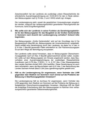 2 Zwischenzeitlich hat der Landkreis als zuständige untere Wasserbehörde die erforderliche Ausnahmegenehmigung am 19.05.2014 für den in Rede stehen- den Bebauungsplan nach § 78 Abs. 2 und 3 WHG erteilt (vgl. Anlage). Die Landesregierung sieht, soweit die gesetzlichen Voraussetzungen eingehal- ten werden, aufgrund der verfassungsrechtlich garantierten Planungshoheit der Kommune, keine Eingriffsmöglichkeit. 2. Wie sollte sich der Landkreis in seiner Funktion als Genehmigungsbehör- de für den Bebauungsplan für das Baugebiet an der Großen Gartenstraße in Gommern nach Ansicht der Landesregierung verhalten? Antwort bitte begründen. Der Bebauungsplan „Große Gartenstraße“ wird auf der Grundlage des § 13a Baugesetzbuch (BauGB) als „Bebauungsplan der Innenentwicklung“ aufgestellt. Damit entfällt eine Genehmigung durch den Landkreis, da diese nur in den in § 10 Abs. 2 BauGB genannten Fällen erforderlich ist. Der Flächennutzungsplan ist auf dem Wege der Berichtigung anzupassen. Der Landkreis sollte darauf hinweisen, dass im Bebauungsplan Überschwem- mungsgebiete nach § 9 Abs. 5 BauGB gekennzeichnet werden sollen. Zusätz- lich sollte auf dem Bebauungsplan ein Hinweis angebracht werden, dass Bau- vorhaben einer Ausnahmegenehmigung der zuständigen Wasserbehörde (Landkreis) nach § 78 Abs. 3 WHG i. V. m. § 101 Abs. 2 des Wassergesetzes des Landes Sachsen-Anhalt (WG LSA) bedürfen. Diese Genehmigung ist auch dann erforderlich, wenn die Bauvorhaben nach § 61 Abs. 2 der Bauordnung des Landes Sachsen-Anhalt (BauO LSA) (bau-)genehmigungsfrei gestellt sind. 3. Hält es die Landesregierung für angemessen, wenn Vertreter des LHW gegenüber dem Stadtrat von Gommern noch einmal auf die Probleme der Bebauung in Überflutungsgebieten hinweisen? Die Landesregierung hält es durchaus für angemessen, wenn Vertreter des LHW gegenüber dem Stadtrat von Gommern auf die Probleme der Bebauung in festgesetzten Überschwemmungsgebieten hinweisen. Allerdings trifft die Stadt die endgültige Entscheidung über den Bebauungsplan im Rahmen ihrer verfas- sungsrechtlich garantierten Selbstverwaltungshoheit.