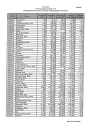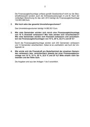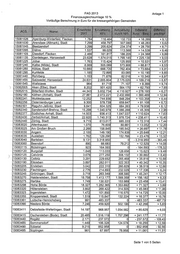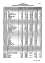 2 Die Finanzausgleichsumlage umfasst gemäß Gesetzentwurf nicht nur die Steu- erkraftmesszahl sondern auch die Schlüsselzuweisungen A und B. Nach der vorläufigen Berechnung für das Jahr 2013 beträgt die Finanzausgleichsumlage 132.653.368 Euro. 2. Wie hoch wäre das gesamte Umverteilungsvolumen? Das Umverteilungsvolumen beträgt 14.882.821 Euro. 3. Wie viele Gemeinden würden sich durch eine Finanzausgleichsumlage von 10 % finanziell verbessern? Wie viele würden sich verschlechtern? Wie viele Gemeinden würden sich finanziell verbessern und verschlech- tern bei Finanzausgleichsumlagen von 15 %, 20 %, 22,5 % und 25 %? Durch die Finanzausgleichsumlage würden sich 203 Gemeinden verbessern und 13 Gemeinden verschlechtern. Dabei ist es unerheblich, wie hoch der Um- lagesatz ist. 4. Wie würde sich die Finanzkraft pro Bedarfseinheit der einzelnen Gemein- den verbessern bzw. verschlechtern (jeweils bei einer Finanzausgleichs- umlage von 10 %, 15 %, 20 %, 22,5 % und 25 %)? Bitte einzeln nach Ge- meinden und der Höhe nach. Die Angaben sind aus den Anlagen 1 bis 5 ersichtlich.