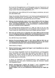 Landtag von Sachsen-Anhalt Drucksache 6/3884 17.03.2015 Antwort der Landesregierung auf eine Kleine Anfrage zur schrift- lichen Beantwortung Abgeordneter Uwe Loos (DIE LINKE) Nachwuchsgewinnung bei Übungsleiter/innen und Trainer/innen sowie Wett- kampf- und Schiedsrichter/innen Kleine Anfrage - KA 6/8668 Vorbemerkung des Fragestellenden: Mit der laufenden demografischen Entwicklung vollzieht sich ein Wandel der Rah- menbedingungen für den Sport in Sachsen-Anhalt. Unverzichtbar für den Sportbe- trieb sind die zahlreichen Übungsleiter/innen und Trainer/innen sowie die Wettkampf- und Schiedsrichter/innen, die mit ihrer Tätigkeit einen wertvollen Beitrag für das Ge- lingen des sportlichen Wettbewerbs leisten. Antwort der Landesregierung erstellt vom Ministerium für Inneres und Sport Namens der Landesregierung beantworte ich die Kleine Anfrage wie folgt: Vorbemerkung: Da dem Ministerium für Inneres und Sport die statistischen Angaben zur Beantwor- tung der Fragen nicht vorliegen, hat das MI den Landessportbund Sachsen-Anhalt e. V. (LSB) um Zuarbeit gebeten. 1. Wie hoch war jeweils zum 31. Dezember der Jahre 2009 bis 2014 die Zahl der tätigen und lizenzierten Übungsleiter/innen und Trainer/innen in den einzelnen Kreis- und Stadtsportbünden, in den verschiedenen Landes- fachverbänden und in Sachsen-Anhalt insgesamt? Hinweis: Die Anlage ist als Objekt beigefügt und öffnet durch Doppelklick im Netz den Acrobat Reader. (Ausgegeben am 18.03.2015)