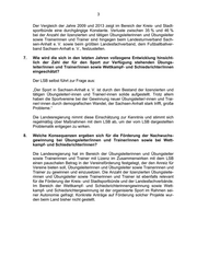 3 Der Vergleich der Jahre 2009 und 2013 zeigt im Bereich der Kreis- und Stadt- sportbünde eine durchgängige Konstante. Verluste zwischen 35 % und 46 % bei der Anzahl der lizenzierten und tätigen Übungsleiterinnen und Übungsleiter sowie Trainerinnen und Trainer sind hingegen beim Landesturnverband Sach- sen-Anhalt e. V. sowie beim größten Landesfachverband, dem Fußballballver- band Sachsen-Anhalt e. V., festzustellen. 7. Wie wird die sich in den letzten Jahren vollzogene Entwicklung hinsicht- lich der Zahl der für den Sport zur Verfügung stehenden Übungs- leiter/innen und Trainer/innen sowie Wettkampf- und Schiedsrichter/innen eingeschätzt? Der LSB selbst führt zur Frage aus: „Der Sport in Sachsen-Anhalt e. V. ist durch den Bestand der lizenzierten und tätigen Übungsleiter/-innen und Trainer/-innen solide aufgestellt. Trotz allem haben die Sportvereine bei der Gewinnung neuer Übungsleiter/-innen und Trai- ner/-innen durch demografischen Wandel, der Sachsen-Anhalt stark trifft, große Probleme.“ Die Landesregierung nimmt diese Einschätzung zur Kenntnis und stimmt sich regelmäßig über Maßnahmen mit dem LSB ab, um der vom LSB dargestellten Problematik entgegen zu wirken. 8. Welche Konsequenzen ergeben sich für die Förderung der Nachwuchs- gewinnung bei Übungsleiter/innen und Trainer/innen sowie bei Wett- kampf- und Schiedsrichter/innen? Die Landesregierung hat im Bereich der Übungsleiterinnen und Übungsleiter sowie Trainerinnen und Trainer mit Lizenz im Zusammenwirken mit dem LSB einen pauschalen Betrag in der Vereinsförderung festgelegt, der den Anreiz für Vereine bieten soll, Übungsleiterinnen und Übungsleiter sowie Trainerinnen und Trainer zu gewinnen und einzusetzen. Die Anzahl der lizenzierten Übungsleite- rinnen und Übungsleiter sowie Trainerinnen und Trainer ist ebenfalls relevant für die Förderung der Kreis- und Stadtsportbünde und der Landesfachverbände. Im Bereich der Wettkampf- und Schiedsrichterinnengewinnung sowie Wett- kampf- und Schiedsrichtergewinnung ist der organisierte Sport im Rahmen sei- ner Autonomie gefragt. Konkrete Anträge auf Förderung solcher Projekte wur- den beim Land bisher nicht gestellt.