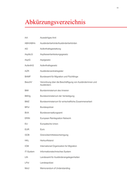93 Abkürzungsverzeichnis AA Auswärtiges Amt ABH/ABHn Ausländerbehörde/Ausländerbehörden AG Aufenthaltsgestattung AsylbLG Asylbewerberleistungsgesetz AsylG Asylgesetz AufenthG Aufenthaltsgesetz AZR Ausländerzentralregister BAMF Bundesamt für Migration und Flüchtlinge BeschV Verordnung über die Beschäftigung von Ausländerinnen und Ausländern BMI Bundsministerium des Inneren BMVg Bundesministerium der Verteidigung BMZ Bundesministerium für wirtschaftliche Zusammenarbeit BPol Bundespolizei BVA Bundesverwaltungsamt ERIN European Reintegration Network EU Europäische Union EUR Euro GÜB Grenzübertrittsbescheinigung HKL Herkunftsland IOM International Organization for Migration IT-System Informationstechnisches System LfA Landesamt für Ausländerangelegenheiten LPol Landespolizei MoU Memorandum of Understanding