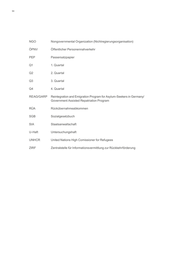 94 NGO Nongovernmental Organization (Nichtregierungsorganisation) ÖPNV Öffentlicher Personennahverkehr PEP Passersatzpapier Q1 1. Quartal Q2 2. Quartal Q3 3. Quartal Q4 4. Quartal REAG/GARP Reintegration and Emigration Program for Asylum-Seekers in Germany/ Government Assisted Repatriation Program RÜA Rückübernahmeabkommen SGB Sozialgesetzbuch StA Staatsanwaltschaft U-Haft Untersuchungshaft UNHCR United Nations High Comissioner for Refugees ZIRF Zentralstelle für Informationsvermittlung zur Rückkehrförderung