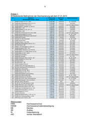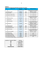 4 Anlage 1: 49 Bedeutende Maßnahmen der Deichsanierung seit dem 01.01.2013 LK Maßnahme Finanzierungs‐ Maßnahme‐ Maßnahmeabschluss Sanierung HWS‐Anlagen ‐ Deiche summe in € beginn JL HWSB Fischbeck km 41,3 - 48,00 31.927.582 20.08.2013 vor. 31.08.2018 MD HWSB Elbumfluthauptdeich links km 8,4-15 10.702.958 18.08.2014 24.04.2016 SLK HWSB Umflutdeich li. Km 2,07-8,4 9.157.759 01.10.2016 noch nicht abgeschlossen MD HWSB Elbdeich li. Glindenb. km 3,55-7,8 7.127.978 25.08.2014 25.07.2016 WB HWSB Elster, 4. BA 6.354.637 22.06.2015 01.09.2016 SLK HWSB Saaledeich re. Km 1,06 - 4,0 6.038.633 20.10.2014 14.06.2016 WB HWSB Elster, 3. BA 5.959.375 29.09.2014 03.11.2016 SDL HWSB Deich Schönhausen IV km 48,1-49,95 4.936.472 06.07.2016 noch nicht abgeschlossen JL HWSB Herrenkrugdeich km 0,0-3,4 4.913.133 30.04.2016 vor. 30.11.2018 SDL HWSB Elbedeich HVB Nitzow km 84,7 bis 87 4.622.976 05.07.2016 25.09.2017 WB HWSB Deich Gorsdorf 4.386.324 11.08.2014 10.04.2015 SLK NB Deich OL Klein Schierstedt 4.284.678 14.11.2016 vor. 30.11.2018 ABI HWSB Hochufer Aken 4.261.408 14.09.2015 12.12.2016 WB AB Deich Klossa 1. bis 3. BA 6.306.426 02.01.2013 30.01.2018 SLK HWSB Elbumfluthauptdeich links km 15,1-1 3.774.158 18.08.2014 23.07.2015 WB NB HWS Elster 2. BA 3.581.824 22.04.2014 29.10.2015 SDL HWSB re. ED Hohengöhren km 56,2 -57,1 3.568.581 24.04.2014 08.10.2015 SDL HWSB Quitzöbel km 90,2 - 91,9 3.554.073 24.04.2014 07.04.2015 JL HWSB Elbdeich Gerwisch re. km 0,0-0,79 3.367.310 29.06.2015 20.12.2016 MD HWSB Elbdeich re. OL SBK-Grünew. km 29,1 3.364.908 04.05.2015 03.06.2016 SDL HWSB Zerben km 20,4 - 22,30 3.318.533 08.06.2015 08.12.2016 SLK HWSB DLS Schönebeck 3.088.836 30.08.2015 noch nicht abgeschlossen MD HWSB MD Oststraße 3.080.109 01.04.2016 23.11.2017 SDL HWSB Weißewarte 2.BA, km 22,74 - 25,7 2.878.838 04.07.2017 vor. 30.10.2018 SLK HWSB Saaledeich re. km 0,4-1,06 2.843.126 01.07.2013 27.05.2014 WB AB Deich Kremitz 2.767.075 01.10.2013 28.07.2015 WB NB HWS Elster 1. BA 2.767.016 04.07.2013 26.09.2014 WB HWSB Stadtdeich Pretzsch 2.720.526 20.04.2016 23.05.2017 DE HWSB/IS Deich SW Kapengraben BA 1-3 5.165.603 16.06.2014 04.07.2017 SDL AB Deich Schönhausen III; km 50,70-51,70 2.612.770 15.07.2013 24.10.2014 ABI HWSB Deich Jeßnitz-West 3.530.341 17.02.2014 31.03.2018 JL HWSB Parey km 27,63 - 28,73 2.579.767 13.07.2015 12.08.2016 JL HWSB Parchau km 16,0 - 17,5 2.572.703 02.07.2015 18.12.2016 JL HWSB Elbehauptdeich rechts Dornburg 2.562.100 27.02.2017 05.07.2018 WB HWSB Deich Mönchenhöfe 3.BA 2.545.835 08.08.2016 vor. 30.11.2018 SDL HWSB Schönhausen km 53,0-54,9 2.502.326 15.05.2017 noch nicht abgeschlossen WB HWSB Deich Schw. Elster, Hemsendorf-Kien 2.497.714 01.07.2016 vor. 31.10.2018 HAL HWSB Halle-Neustadt, 2. BA, km 0,00-2,5 2.384.923 24.04.2017 12.12.,2017 ABI NB Deich Jeßnitz West BA 4 2.379.072 2015 2016 SDL IS rAD, 0,0 - 8,0, Seeh.-Beuster 2.-3.BA 2.366.999 01.09.2014 18.08.2016 ABI HWSB HWS Deich Jeßnitz West BA 5 2.331.479 15.08.2016 noch nicht abgeschlossen SDL HWSB Neuermark-Lübars km 64,0 - 65,7 2.302.037 22.09.2014 19.10.2015 SK HWSB Deich Kirchfährendorf km 0,3 -0,75 2.280.961 09.11.2015 14.03.2017 JL HWSB Ehlerückstaudeich li. km 0,0-1,2 2.253.098 26.09.2013 14.08.2014 JL HWSB Niegripp km 2,14-3,7 2.225.665 30.05.2016 27.10.2017 WB AB Deich Arnsnesta 2.102.167 27.09.2016 24.10.2017 SDL HWSB BD Bölsdorf-Köckte, 2. BA, km 17,4- 2.063.977 19.09.2016 23.08.2017 WB HWSB Deich Wartenburg-Dabrun, 2. BA 2.047.655 11.05.2015 15.10.2015 SDL HWS-Niveau Deich Demker, 2.BA 2.026.893 15.05.2014 15.10.2015 Abkürzungen HWS Hochwasserschutz HWSB Hochwasserschadensbeseitigung NB Neubau AB Ausbau IS Instandsetzung rAD rechter Alanddeich