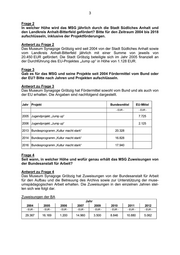 3 Frage 2 In welcher Höhe wird das MSG jährlich durch die Stadt Südliches Anhalt und den Landkreis Anhalt-Bitterfeld gefördert? Bitte für den Zeitraum 2004 bis 2018 aufschlüsseln, inklusive der Projektförderungen. Antwort zu Frage 2 Das Museum Synagoge Gröbzig wird seit 2004 von der Stadt Südliches Anhalt sowie vom Landkreis Anhalt-Bitterfeld jährlich mit einer Summe von jeweils von 20.450 EUR gefördert. Die Stadt Gröbzig beteiligte sich im Jahr 2005 finanziell an der Durchführung des EU-Projektes „Jump up“ in Höhe von 1.128 EUR. Frage 3 Gab es für das MSG und seine Projekte seit 2004 Fördermittel vom Bund oder der EU? Bitte nach Jahren und Projekten aufschlüsseln. Antwort zu Frage 3 Das Museum Synagoge Gröbzig hat Fördermittel sowohl vom Bund und als auch von der EU erhalten. Die Angaben sind nachfolgend dargestellt. Jahr Projekt Bundesmittel EU-Mittel - EUR - - EUR - 2005 Jugendprojekt „Jump up“ 7.725 2006 Jugendprojekt „Jump up“ 2.125 2013 Bundesprogramm „Kultur macht stark“ 20.328 2014 Bundesprogramm „Kultur macht stark“ 16.828 2016 Bundesprogramm „Kultur macht stark“ 17.940 Frage 4 Seit wann, in welcher Höhe und wofür genau erhält das MSG Zuweisungen von der Bundesanstalt für Arbeit? Antwort zu Frage 4 Das Museum Synagoge Gröbzig hat Zuweisungen von der Bundesanstalt für Arbeit für den Aufbau und die Betreuung des Archivs sowie zur Unterstützung der muse- umspädagogischen Arbeit erhalten. Die Zuweisungen in den einzelnen Jahren stel- len sich wie folgt dar. Zuweisungen der BA Jahr 2004 2005 2006 2007 2009 2010 2011 2012 - EUR - - EUR - - EUR - - EUR - - EUR - - EUR - - EUR - - EUR - 29.367 16.169 1.200 14.960 3.500 8.846 10.880 5.062