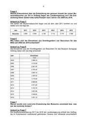 4 Frage 5 Welche Erkenntnisse über die Entwicklung der genauen Anzahl der reinen Mu- seumsbesucher vor Ort in Gröbzig liegen der Landesregierung vor? Die Ent- wicklung dieser Zahlen bitte aufschlüsseln nach Jahren von 2004 bis 2016. Antwort zu Frage 5 Die Zahlen der Museumsbesucher liegen erst ab dem Jahr 2011 konkret vor und stellen sich wie folgt dar. Jahr 2011 2012 2013 2014 2015 2016 Besucher 2.950 3.305 3.109 3.115 3.175 3.368 Frage 6 Wie haben sich die Einnahmen aus Eintrittsgeldern von Besuchern für das MSG seit 2004 bis 2016 entwickelt? Antwort zu Frage 6 Die Einnahmen aus den Eintrittsgeldern von Besuchern für das Museum Synagoge Gröbzig haben sich wie folgt entwickelt. Jahr Einnahmen - EUR - 2004 2.868,10 2005 3.312,50 2006 2.461,00 2007 2.703,30 2008 3.087,10 2009 2.297,50 2010 3.715,60 2011 2.668,80 2012 2.071,60 2013 2.703,70 2014 3.091,60 2015 2.526,60 2016 3.001,10 Frage 7 Warum wurde vom Land eine Evaluierung des Museums veranlasst bzw. was war der konkrete Anlass? Antwort zu Frage 7 Die Koalitionsvereinbarung 2011 bis 2016 der Landesregierung enthielt den Auftrag, die im Kulturbereich institutionell geförderten Vereine und Verbände einschließlich