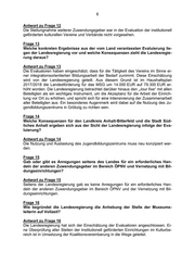 6 Antwort zu Frage 12 Die Stellungnahme weiterer Zuwendungsgeber war in der Evaluation der institutionell geförderten kulturellen Vereine und Verbände nicht vorgesehen. Frage 13 Welche konkreten Ergebnisse aus der vom Land veranlassten Evaluierung lie- gen der Landesregierung vor und welche Konsequenzen zieht die Landesregie- rung daraus? Antwort zu Frage 13 Die Evaluatoren haben eingeschätzt, dass für die Tätigkeit des Vereins im Sinne ei- ner integrationsorientierten Bildungsarbeit der Bedarf zunimmt. Diese Einschätzung wird von der Landesregierung geteilt. Aus diesem Grund ist im Haushaltsplan 2017/2018 die Landesförderung für das MSG um 14.000 EUR auf 79.300 EUR er- höht worden. Die Landesregierung betrachtet darüber hinaus den „Jour fixe“ mit allen Beteiligten als ein wichtiges Instrument, um die Akzeptanz für die Arbeit der Einrich- tung vor Ort zu erhöhen, und spricht sich für eine Intensivierung der Zusammenarbeit aller Beteiligten aus. Ein besonderes Augenmerk wird dabei auf die Nutzung des Ju- gendbildungszentrums in Gröbzig zu richten sein. Frage 14 Welche Konsequenzen für den Landkreis Anhalt-Bitterfeld und die Stadt Süd- liches Anhalt ergeben sich aus der Sicht der Landesregierung infolge der Eva- luierung? Antwort zu Frage 14 Die Nutzung und Auslastung des Jugendbildungszentrums muss neu konzipiert wer- den. Frage 15 Gab oder gibt es Anregungen seitens des Landes für ein erforderliches Han- deln der anderen Zuwendungsgeber im Bereich ÖPNV und Vernetzung mit Bil- dungseinrichtungen? Antwort zu Frage 15 Seitens der Landesregierung gab es keine Anregungen für ein erforderliches Han- deln der anderen Zuwendungsgeber im Bereich ÖPNV und der Vernetzung mit Bil- dungseinrichtungen. Frage 16 Wie begründet die Landesregierung die Anhebung der Stelle der Museums- leiterin auf Vollzeit? Antwort zu Frage 16 Die Landesregierung hat sich der Einschätzung der Evaluatoren angeschlossen. Ei- ne Überprüfung aller Stellen der Institutionell geförderten Einrichtungen im Kulturbe- reich ist in Umsetzung der Koalitionsvereinbarung in die Wege geleitet.