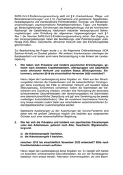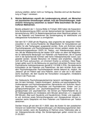 3 wortung zuließen, stehen nicht zur Verfügung. Überdies wird auf die Beantwor- tung zu Frage 1 verwiesen. 3. Welche Maßnahmen ergreift die Landesregierung aktuell, um Menschen mit psychischen Erkrankungen zeitnah, trotz der Einschränkungen, medi- zinische Versorgung zukommen zu lassen? Bitte beschreiben Sie die ge- troffenen Maßnahmen. Bereits anlässlich der 1. Corona-Welle im Frühjahr 2020 haben die Kassenärzt- liche Bundesvereinigung (KBV) und der Spitzenverband der Gesetzlichen Kran- kenversicherung (GKV) im Bewertungsausschuss einen Beschluss gefasst, um für die Patienten und Patientinnen die Sonderregelung für telefonische und videogestützte Konsultationen zu ermöglichen. Seit dem 02.11.2020 gilt die Regelung, dass angesichts der steigenden Infekti- onszahlen in der Corona-Pandemie die Möglichkeiten für Konsultationen per Telefon für alle Fachgruppen ausgeweitet wurden. Ärzte und Ärztinnen sowie Psychotherapeuten und Psychotherapeutinnen können seitdem wieder die Ge- bührenordnungspositionen (GOP) für Telefon- und Videoberatungen abrech- nen. Mit der Wiedereinführung der beiden GOP sollen vor allem die Möglichkei- ten für telefonische Beratungen von Patienten und Patientinnen, die im Quartal nicht in die Sprechstunde kommen oder keine Videosprechstunde nutzen, aus- geweitet werden. Gerade Menschen mit Infekten wird empfohlen, möglichst nicht die Praxis aufzusuchen, um chronisch Kranke zu schützen. Diese Rege- lungen gelten auch für die Betreuung von psychisch erkrankten Personen durch Psychiatrische Institutsambulanzen gemäß § 118 SGB V (PIA). Die telefonische Konsultation ist bei Patienten und Patientinnen, die dem Arzt/der Ärztin oder dem Psychotherapeut/der Psychotherapeutin bereits bekannt ist, möglich. Als „bekannt“ gilt ein Patient oder eine Patientin, wenn er oder sie in den letzten sechs Quartalen, die dem Quartal der Konsultation vorausgehen, mindestens einmal in der Praxis war. Die Ostdeutsche Psychotherapeutenkammer benennt nachfolgende Fachgrup- pen mit dem höchsten „Telefon-Kontingent“: ärztliche und psychologische Psy- chotherapeuten und Psychotherapeutinnen, Nervenärzte und -ärztinnen, Neuro- logen und Neurologinnen, Psychiater und Psychiaterinnen, Kinder- und Ju- gendpsychotherapeuten und -psychotherapeutinnen sowie Kinder- und Ju- gendpsychiater und -psychiaterinnen. Sie können pro Patient/Patientin bis zu 20 Telefongespräche von mindestens zehn Minuten abrechnen, d. h. insgesamt 200 Minuten. Aber auch Hausärzte und Hausärztinnen, Kinder- und Jugendärz- te und -ärztinnen sowie Schmerztherapeuten und -therapeutinnen können in- zwischen sechs Gespräche mit ihren Patienten und Patientinnen per Telefon abrechnen. Darüber hinaus gilt seit dem 02.11.2020, dass die Kosten für den postalischen Versand von bestimmten Folgeverordnungen und Überweisungsscheinen über- nommen werden, wenn die Ausstellung im Rahmen eines Telefonates oder ei- ner Videosprechstunde erfolgt. Die Sonderregelungen gelten vorerst bis zum 31.03.2021.