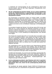 4 In Anbetracht der Versorgungslage hat die Landesregierung aktuell keine Kenntnis darüber, dass ein über diese Regelungen hinausgehendes Hand- lungserfordernis anzeigt ist. 4. Hat die Landesregierung Kenntnis darüber, ob es zu einem signifikanten Anstieg der Patientenaufnahme in psychiatrischen Einrichtungen in den Monaten März 2020 bis November 2020 kam? Bitte nach Monaten und Be- legungszahlen auflisten. Aus Forschungen zu psychischen Folgen von früheren SARS- und MERS- Epidemien ist bekannt, dass eine solche Krise u. a. Menschen mit psychischer Vorerkrankung erheblich psychosozial belasten kann. Zunächst zeigen sich psychische Veränderungen auf pandemische Ereignisse nicht reflexhaft. Bei Pandemien kommt es, so wie auch bei Katastrophen, häufig und in der Regel zunächst erst einmal zu einer unmittelbaren Anpassungs- und Bewältigungsre- aktion. Im kumulativen Vergleich der Wochen 12 bis 48 des Jahres 2019 mit dem Jahr 2020 kam es zu einem Rückgang der stationären Aufnahmen von AOK-Ver- sicherten im Bereich Psychiatrie um 17 %. Die Aufnahmen werden pro Kalen- derwoche erfasst und dargestellt. Da sich eine Kalenderwoche über zwei Mona- te erstrecken kann, ist eine Darstellung der Belegungszahlen nach Monaten nicht möglich. Eine Analyse der Ursachen liegt nicht vor. Es ist aber davon auszugehen, dass, wie auch im somatischen Bereich, unter anderem die Angst vor einer Anste- ckung im Krankenhaus, Patienten und Patientinnen von einer stationären Be- handlung abgehalten haben. Auch die psychiatrischen Krankenhäuser und Ein- richtungen des Landes gaben an, dass es zu keinem signifikanten Anstieg der Patientenaufnahmen in dem o. g. Zeitraum kam. Es wurden keine weiteren Auf- fälligkeiten gemeldet. Die Landesregierung kann aus einer solchen kurzen Datenerhebung absoluter Fallzahlen über den o. g. Zeitverlauf nicht schließen, dass die Situation von Personen mit psychischer Erkrankung richtig dargestellt werden konnte. Seitens psychiatrisch-psychotherapeutischer Akteure wird prognostiziert, dass die Zu- nahme von psychischen Störungen zeitlich verzögert auftritt. Es bleibt somit abzuwarten, ob es sich bei den derzeitigen psychosozialen Be- lastungen eher um kurzfristige Folgen im Sinne einer „natürlichen“ Reaktion auf das pandemische Geschehen handelt oder ob sich die Belastungsreaktionen zu psychischen Störungen wie Depressionen, Anpassungsstörungen oder Angsterkrankungen entwickeln werden. 5. Ist der Landesregierung bekannt, dass Patienten nicht mehr in psychiatri- schen Tageskliniken versorgt werden konnten? Wenn ja, wie erfolgte die Behandlung? Wenn nein, warum hat die Landesregierung darüber keine Kenntnis? Mit Inkrafttreten der damals geltenden Zweiten SARS-CoV-2-Eindämmungs- verordnung wurde in § 9 „Psychiatrische und geriatrische Tageskliniken Einrich-