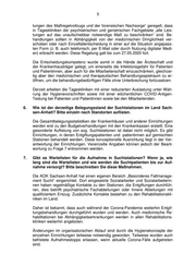 5 tungen des Maßregelvollzugs und der forensischen Nachsorge“ geregelt, dass in Tageskliniken der psychiatrischen und geriatrischen Fachgebiete „alle Leis- tungen auf das unaufschiebbar notwendige Maß zu beschränken“ sind. Be- handlungen sollten in Abhängigkeit von der medizinischen Dringlichkeit ver- schoben oder nach Einzelfallentscheidung in einer auf die Situation angepass- ten Form (z. B. auch telefonisch, per E-Mail oder durch Nutzung digitaler Medi- en) erbracht werden. Diese Regelung galt bis zum 27.05.2020 fort. Die Entscheidungskompetenz wurde somit in die Hände der Ärzteschaft und der Krankenhausträger gelegt, um einerseits die Infektionsgefahr für Patienten und Patientinnen, aber auch für die Mitarbeiterschaft einzuschränken, gleichzei- tig aber den medizinischen und therapeutischen Behandlungsspielraum zu er- öffnen, um die behandlungsbedürftigen Fälle ohne Unterbrechung fortzusetzen. Derzeit arbeiten die Tageskliniken mit einer reduzierten Auslastung unter Wah- rung der Hygienevorschriften sowie mit einer wöchentlichen COVID-Antigen- Testung bei Patienten und Patientinnen sowie bei den Mitarbeitenden. 6. Wie ist der derzeitige Belegungsstand der Suchtstationen im Land Sach- sen-Anhalt? Bitte einzeln nach Standorten auflisten. Die Gesamtbelegungsstatistiken der Krankenhäuser und anderer Einrichtungen werden erst zu den Budgetverhandlungen mit den Krankenkassen erstellt. Eine gesonderte Auflistung von sog. Suchtstationen ist dabei nicht möglich. Es gibt Einrichtungen, in denen Entgiftungspatienten und -patientinnen auf gemischten Stationen behandelt werden. Diese konzeptionelle Ausrichtung liegt in der Ver- antwortung der Einrichtungen. Vereinzelte Angaben können jedoch der Beant- wortung zu Frage 7 entnommen werden. 7. Gibt es Wartelisten für die Aufnahme in Suchtstationen? Wenn ja, wie lang sind die Wartelisten und wie werden die Suchtpatienten bis zur Auf- nahme versorgt? Bitte beschreiben Sie diese Maßnahmen. Die AOK Sachsen-Anhalt hat einen eigenen Bereich „Besonderes Fallmanage- ment Sucht“ eingerichtet. Dort eingesetzte Sozialarbeiter und Sozialarbeiterin- nen haben regelmäßige Kontakte zu den Stationen, die Entgiftungen durchfüh- ren, dies betrifft psychiatrische Fachabteilungen oder Innere Abteilungen mit qualifiziertem Entzug. Zusätzliche Kontakte bestehen zu den Rehabilitationskli- niken im Land. Daher ist bekannt, dass auch während der Corona-Pandemie weiterhin Entgif- tungsbehandlungen durchgeführt wurden und werden. Auch medizinische Re- habilitationen bei Abhängigkeitserkrankungen werden in allen Rehabilitations- kliniken weiterhin angeboten. Änderungen im organisatorischen Ablauf sind durch die Hygienekonzepte der einzelnen Einrichtungen teilweise notwendig geworden. Teilweise wurden auch befristete Aufnahmestopps erlassen, wenn aktuelle Corona-Fälle aufgetreten sind.