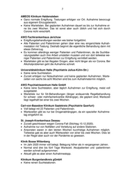 7 AMEOS Klinikum Haldensleben Ganz normale Entgiftung. Testungen erfolgen vor Ort. Aufnahme bevorzugt aus eigenem Einzugsbereich. Keine Wartelisten. Bei geplanten Aufnahmen dauert es bis zur Aufnahme ei- ne bis zwei Wochen. Das ist sonst aber auch üblich und hat sich durch Corona nicht verschärft. AWO Fachkrankenhaus Jerichow Entgiftungsbehandlungen werden wie bisher fortgeführt. Alle Patienten und Patientinnen gehen über eine neu eingerichtete Aufnah- mestation mit Testung. Deshalb beginnt die eigentliche Behandlung dann mit etwas Zeitverzug. Es kommen allerdings weniger Patienten und Patientinnen, da die Suchtbe- ratungsstellen auch ihre Arbeit umstellen mussten und von dort teilweise we- niger Patienten und Patientinnen zur Entgiftung vermittelt werden. Wartelisten gibt es bei illegalen Drogen, aber nicht länger als vor Corona. Bei Alkoholproblemen geht die Aufnahme schnell. Universitätsklinikum Halle (Psychiatrie Julius-Kühn-Str.) Keine reine Suchtstation. Zurzeit erfolgen nur Notaufnahmen und keine geplanten Aufnahmen. Warte- zeiten von sechs bis acht Wochen sind bis zum Aufnahmetermin möglich. AWO Psychiatriezentrum Halle GmbH Keine reine Suchtstation, aber täglich Aufnahmen zur Entgiftung, meist voll ausgelastet. Warteliste nur für S4-Behandlungen (länger andauernde Regelbehandlung für schwer- oder mehrfacherkrankte Abhängige), die geplant sind; Wartezeit liegt regelhaft bei einer bis zwei Wochen. Carl-von-Basedow Klinikum Saalekreis (Psychiatrie Querfurt) Voll belegt mit 22 Patienten und Patientinnen. Wartezeiten gibt es nur bei Drogenabhängigen, da ein spezieller Aufnahme- tag eingeführt ist. St. Joseph-Krankenhaus Dessau Zurzeit geschlossen wegen Corona-Fall (Stichtag 10.12.2020). Aufnahme nur von Notfällen und Verteilung auf andere Stationen. Ansonsten waren in den letzten Wochen kurzfristige Aufnahmen möglich. Teilweise gab es aber auch Wartezeiten von einer bis zwei Wochen. Dies ist in der Regel aber auch vor der Pandemie so gewesen. Klinik Bosse Wittenberg Im Jahr 2020 immer voll belegt. Belegung höher als in vergangenen Jahren. Normal sind drei bis fünf Tage Wartezeit. Akutpatienten und -patientinnen werden schnell aufgenommen. Aktuell gibt es aber einen Aufnahmestopp. Klinikum Burgenlandkreis gGmbH Keine reinen Suchtstationen.