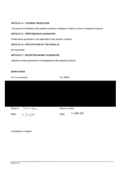 ARTICLE 1.4 - PAYMENT MODALITIES The payment modalities of the Specific Contract is detailed in Article 1.6 of the Framework Contract ARTICLE 1.5 - PERFORMANCE GUARANTEE Performance guarantee is not applicable to this Specific Contract. ARTICLE 1.6 - EXPLOITATION OF THE RESULTS Not applicable ARTICLE 1.7 - RETENTION MONEY GUARANTEE Retention money guarantee is not applicable to this Specific Contract. SIGNATURES For the contractor For EMSA Done at: Tours de Amess Done at Lisbon 07 DEC 2018 Date: Ab | los Date: In duplicate in English. Page 20f2