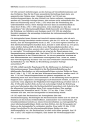 UBA-Texte: Evaluation des Umweltinformationsgesetzes zuständig sind und dass, soweit es um öffentliche Stellen geht, immer ein Widerspruchsverfahren durchzuführen ist. Diese gilt auch für den Drittschutz. Nicht geregelt ist z.B., wie zu verfahren ist, wenn die informationspflichtige Stelle entschieden hat, die Information nach dessen Anhörung gemäß § 9 Abs. 1 UIG gegen den Willen des Dritten herauszugeben. Aus dem Grundsatz des effektiven Rechtsschutzes nach Art. 19 Abs. 4 GG wird gefolgert, dass vor der tatsächlichen Übermittlung der Informationen an die Antragsteller*in eine Anhörung des Dritten erfolgen muss. Damit wird dem Dritten ermöglicht, über einen Drittwiderspruch nach § 6 Abs. 2 UIG, bzw., im Falle von privaten informationspflichtigen Stellen, über ein Überprüfungsverfahren nach § 6 Abs. 3 UIG und/oder eine Klage, ggf. auch im Wege des einstweiligen Rechtsschutzes, gegen die beabsichtigte Herausgabe vorzugehen. Bei informationspflichtigen privaten Stellen fehlt für den Fall, dass ein Dritter gegen eine Herausgabe der Information durch die Stelle vorgehen möchte, eine Regelung wie in § 6 Abs. 3 UIG über ein Überprüfungsverfahren. Rechtsschutz ist hier durch eine Leistungsklage in Form einer Unterlassungsklage beim Verwaltungsgericht möglich. Will ein betroffener Dritter die Herausgabe der Information verhindern, muss er mangels aufschiebender Wirkung der Klage einen Antrag auf Erlass einer einstweiligen Anordnung nach § 123 VwGO stellen. Eine Frist für die Bescheidung des Widerspruchs ist in § 6 Abs. 2 UIG anders als bei privaten informationspflichtigen Stellen im Rahmen des Überprüfungsverfahrens gemäß § 6 Abs. 4 Satz 2 UIG (Frist für die Übermittlung des Ergebnisses eine Frist von einem Monat) nicht vorgesehen. Daher ist anzudenken, auch im Widerspruchsverfahren eine Monatsfrist vorzugeben. Vergleichbar ist auch für die allgemeine Leistungsklage (bzw. die Unterlassungsklage) gegen Entscheidungen privater informationspflichtiger Stellen keine Frist vorgesehen. Aus Gründen der Rechtsklarheit wird insoweit eine entsprechende Befristung gefordert. Das In-Camera-Verfahren nach § 99 Abs. 2 VwGO dient dazu, eine vorzeitige Erledigung der Hauptsache durch Bekanntgabe der begehrten Informationen, die wegen der Vorlagepflicht nach § 99 Abs. 1 VwGO und des Akteneinsichtsrechts nach § 100 VwGO ansonsten eintreten würde, zu vermeiden. Jedoch sind die Regelungen für das In-Camera-Verfahren nicht auf alle Beteiligten des § 2 Abs. 1 UIG anwendbar. So fehlt eine Aufsichtsbehörde über die Regierung, und auch für Organe privatrechtlich organisierter Rechtsträger gibt es keine oberste Aufsichtsbehörde. Vorgeschlagen wird, das UIG um eine Regelung zu ergänzen, nach der ein In-Camera-Verfahren vor dem Gericht der Hauptsache durchgeführt werden kann. § 6 Abs. 3 Satz 3 UIG schließt im Falle der Ablehnung durch eine private informationspflichtige Stelle eine Klage der Antragsteller*in gegen die Aufsichtsbehörde nach § 13 Abs. 1 UIG, d. h. die Behörde, die für die Kontrolle nach § 2 Abs. 2 UIG zuständig ist, aus. Es ist nicht ersichtlich, warum die ansonsten übliche Möglichkeit des Vorgehens gegenüber der Aufsichtsbehörde kategorisch ausgeschlossen werden muss. Eine eindeutige Begründung hierzu findet sich weder in der Literatur noch in den Gesetzesmaterialien. 177