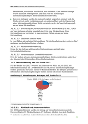 UBA-Texte: Evaluation des Umweltinformationsgesetzes Abbildung 5: Verteilung der Anfragen auf Stellen UIG Studie 2008 Studie 2008 (Anfragen nach UIG des Bundes) Stellen der private Bundesverw information altung: 9 spflichtige Stellen auf Bundeseben e: 7 Anfragen: 178 © Unabhängiges Institut für Umweltfragen e.V. 3.5.3.1.1 Einzelauswertung zu den Stellen der Bundesverwaltung 3.5.3.1.1.1 Rücklauf und Antwortverhalten Bei neun Stellen der Bundesverwaltung wurden Umweltinformationen angefragt. Auf alle Anfragen erfolgte eine Rückmeldung ▶ Fünf Anfragen wurden inhaltlich beantwortet - zwei davon ausführlich und in drei Fällen wurde auf die Internetseite verwiesen. ▶ Einmal lagen der informationspflichtigen Stelle die angefragten Daten nicht vor. ▶ Zweimal wurde die Herausgabe der Information explizit abgelehnt. ▶ Weitere zwei Anfragen wurden an andere Stellen weitergeleitet: Von diesen wurde eine Anfrage anschließend abgelehnt, auf die andere erfolgte keine Rückmeldung. 3.5.3.1.1.2 Einhaltung der gesetzlichen Frist von einem Monat (§ 3 Abs. 3 UIG) Sechs der neun Rückmeldungen erfolgten innerhalb dieser Frist, drei Rückmeldungen erfolgten erst nach Ablauf der Frist. 3.5.3.1.1.3 Gebühren Für acht der neun Rückmeldungen wurden keine Kosten angekündigt. In einem Fall wurden für den Fall der Beantwortung Kosten bis zu 500 Euro angekündigt. 3.5.3.1.1.4 Rechtsbehelfsbelehrung Nur eine der neun Rückmeldungen beinhaltete eine Rechtsbehelfsbelehrung (bei insgesamt drei ablehnenden Rückmeldungen). 3.5.3.1.2 Einzelauswertung zu den privaten informationspflichtigen Stellen auf Bundesebene 3.5.3.1.2.1 Rücklauf und Antwortverhalten Insgesamt wurden bei sieben potenziell privaten informationspflichtigen Stellen auf Bundesebene Umweltinformationen angefragt. ▶ Auf zwei Anfragen gab es keine Rückmeldung, auf fünf Informationsanfragen erfolgte eine Rückmeldung. Zwei Anfragen wurden direkt inhaltlich 45