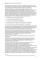 UBA-Texte: Evaluation des Umweltinformationsgesetzes Das Manko teilweiser geringer Rückläufe in speziellen Bereichen des Online- Fragebogens wurde zumindest durch die anschließende telefonische Befragung bei den öffentlichen informationspflichtigen Stellen „ausgeglichen“. Ähnliche Ergebnisse zur auszuwertenden Empirie sind auch bei den Nutzer*innen festzustellen. Relativ gute Rückläufe wurden bei Vertreter*innen der allgemeinen Öffentlichkeit sowie Wirtschaftsvertreter*innen und den Umwelt- und Naturschutzverbänden erzielt. Bei den Journalist*innen sowie den Rechtsanwält*innen hingegen war die Rücklaufquote auf die Online-Umfrage zu niedrig, um eigenständige Aussagen zu diesen Gruppierungen vornehmen zu können. Insgesamt flossen daher in die Evaluation aus der Online-Umfrage 238 Rückmeldungen ein, die sich folgendermaßen zuordnen lassen: ▶ 72 öffentliche informationspflichtige Stellen ▶ 11 private informationspflichtige Stellen ▶ 81 Personen der „Allgemeinen Öffentlichkeit“ ▶ 26 Vertreter*innen von Umwelt- und Naturschutzvereinigungen ▶ 48 Vertreter*innen von Wirtschaftsverbänden/ -unternehmen Zu den aus der Online-Befragung verwertbaren Antworten kamen weitere zwölf Antworten aus den Leitfragen gestützten ca. einstündigen Telefoninterviews mit den öffentlichen informationspflichtigen Stellen aus verschiedenen Bereichen hinzu. Die Telefoninterviews wurden transkribiert und anonymisiert. Neben den Daten aus der Empirie standen für die Evaluation weiterhin die Erkenntnisse des umfangreichen Rechtsgutachtens (Anhang A) und auch die sozialwissenschaftlichen Erkenntnisse aus allen Klageverfahren zum UIG im Zeitraum 2005 bis 2017 (sozialwissenschaftliche Auswertung der Rechtsprechung) zur Verfügung. 79 Weiterhin wurden Ergebnisse und Erkenntnisse der Policy Transfer Studie eingearbeitet. Darüber hinaus wurden die bisherigen empirischen Studien und Daten zur Praxis des UIG herangezogen und teilweise einer nochmaligen Auswertung unterzogen, was bei bestimmten Ergebnissen der Online-Umfrage als Gegenüberstellung dienen konnte. Weitere empirische Diskussions- und Überprüfungsmöglichkeiten für die Evaluation des UIG waren darüber hinaus zwei gut besuchte 80 fachwissenschaftliche Tagungen sowie drei Sitzungen des für das Evaluationsprojekt eingerichteten wissenschaftlichen Beirates. Besonders durch die fachwissenschaftliche Tagung im Februar 2018 in Berlin, die Mitarbeiter*innen verschiedener Ministerien und nachgeordneter Einrichtungen sowie Expert*innen wissenschaftlicher Einrichtungen und Nutzer*innen gleichermaßen zusammenbrachte, wurden spezielle Aspekte zum UIG vertiefend erörtert. So wurde ausführlich die Praxis der Drittbeteiligungsverfahren aus verschiedenen Perspektiven beleuchtet und in der Diskussion ein Austausch zur Häufigkeit von querulatorischen Anfragen zwischen den Ressorts hergestellt. 79 vgl. 2.9. 80 Nationale Tagung im Februar 2018 und internationale Tagung im Dezember 2018 jeweils in Berlin. 48
