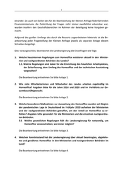 Anlage 1 zu Fragen 1 und 1.1: 1. Welche hausinternen Regelungen zum Homeoffice existieren aktuell in den Ministerien und nachgeordneten Behörden des Landes? 1.1. Welche Regelungen sind dabei für die Einrichtung des häuslichen Arbeitsplatzes, der Zeiterfassung, dem Umfang des Homeoffice und der technischen Ausstattung vorgesehen? Ressort/ Frage 1: Frage 1.1: Behörde oder Einrichtung Ministerium für 1. Rahmendienstvereinbarung über die Ein- 1. Rahmendienstvereinbarung: Umwelt Land- richtung von Heimarbeitsplätzen wirtschaft und Einrichtung: Energie (MULE) 2. Im März 2020 wurde zusätzlich die pande- Die Dienststelle stattet den Heimarbeitsplatz mit den erforderlichen Arbeitsmit- miebedingte Beantragung und Gewährung teln und den notwendigen technischen Geräten aus. Die Bediensteten stellen von Dienstvereinbarung vereinfacht und auf den Arbeitsraum und tragen dessen Kosten. Umstellung Diensttelefon auf Pri- die jeweilige RL/AL-Ebene verlegt und auch vattelefon. die Nutzung privater Technik unter bestimm- ten Sicherheitsvorkehrungen ermöglicht. Zeiterfassung: Ganztägige oder stundenweise Zeiterfassung der Heimarbeit durch den Be- diensteten im ZEUS oder automatische Erfassung der Heimarbeit durch das Referat 12 je nach vereinbartem(n) Heimarbeits-Tag(en) in der Heimarbeits- Vereinbarung; nur bis zur täglichen Sollarbeitszeit möglich Umfang: Grundsätzlich maximal 40% der wöchentlich zu erbringenden Arbeitszeit des Bediensteten. Ausnahmen von der 40%-Regelung sind möglich. Zudem ist Heimarbeit bis zu 40 Stunden im Jahr ohne gesonderte Vereinba- rung möglich. Technische Ausstattung: Dienstlaptop 2. zusätzlich coronabedingt: Umfang je nach Bedarf: Anleitung zur Einrichtung des Zugangs vom Privat-PC mit gesonderter Sicher- heitsvorkehrung und Erfassung der Heimarbeit im Zeiterfassungssystem Seite 1 von 28 4 von 50