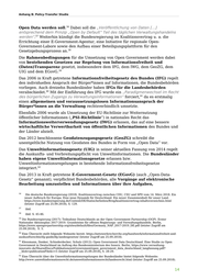 Anhang B: Policy-Transfer Studie Open Data werden soll. Dabei soll die „Veröffentlichung von Daten […] 56 entsprechend dem Prinzip „Open by Default“ Teil des täglichen Verwaltungshandelns werden“. Weiterhin kündigt die Bundesregierung im Koalitionsvertrag u. a. die 57 Errichtung einer E‐Government‐Agentur, eine Initiative für regionale Open‐ Government‐Labore sowie den Aufbau einer Beteiligungsplattform für den 58 Gesetzgebungsprozess an. Die Rahmenbedingungen für die Umsetzung von Open Government werden dabei von bestehenden Gesetzen zur Regelung von Informationsfreiheit und (Daten)Transparenz gesetzt, insbesondere dem IFG, dem IWG, dem GeoZG, dem 59 UIG und dem EGovG. Das 2006 in Kraft getretene Informationsfreiheitsgesetz des Bundes (IFG) regelt den individuellen Anspruch der Bürger*innen auf Informationen, die Bundesbehörden vorliegen. Auch dreizehn Bundesländer haben IFGs für die Landesbehörden verabschiedet. Mit der Einführung des IFG wurde ein „Paradigmenwechsel im Recht 60 des bürgerlichen Zugangs zu Verwaltungsinformationen“ forciert, da es erstmalig 61 einen allgemeinen und voraussetzungslosen Informationsanspruch der Bürger*innen an die Verwaltung rechtsverbindlich umsetzte. Ebenfalls 2006 wurde als Umsetzung der EU-Richtlinie zur Weiternutzung öffentlicher Informationen („PSI-Richtlinie“) in nationales Recht das Informationsweiterverwendungsgesetz (IWG) erlassen, das auf eine bessere wirtschaftliche Verwertbarkeit von öffentlichen Informationen des Bundes und der Länder abzielt. Das 2012 beschlossene Geodatenzugangsgesetz (GeoZG) schreibt die unentgeltliche Nutzung von Geodaten des Bundes in Form von „Open Data“ vor. Das Umweltinformationsgesetz (UIG) in seiner aktuellen Fassung von 2014 regelt die Auskunfts- und Verbreitungspflicht von Umweltinformationen. Die Bundesländer haben eigene Umweltinformationsgesetze erlassen bzw. Umweltinformationsregelungen in bestehende Informationsfreiheitsgesetze 62 integriert. Das 2013 in Kraft getretene E-Government-Gesetz (EGovG) (auch „Open-Data- Gesetz“ genannt), verpflichtet Bundesbehörden, alle Vorgänge auf elektronische Bearbeitung umzustellen und Informationen über ihre Aufgaben, 56 Die deutsche Bundesregierung (2018). Koalitionsvertrag zwischen CDU, CSU und SPD vom 14. März 2018. Ein neuer Aufbruch für Europa. Eine neue Dynamik für Deutschland. Ein neuer Zusammenhalt für unser Land. https://www.bundesregierung.de/Content/DE/StatischeSeiten/Breg/koalitionsvertrag-inhaltsverzeichnis.html (letzter Zugriff am 25.09.2018), S. 129. 57 ibid. 58 ibid. S. 45-46. 59 Die Bundesregierung (2017): Teilnahme Deutschlands an der Open Government Partnership (OGP). Erster Nationaler Aktionsplan 2017-2019. Grundsteine für offenes Regierungs- und Verwaltungshandeln. Berlin, https://www.opengovpartnership.org/sites/default/files/Germany_NAP_2017-2019_DE.pdf (letzter Zugriff am 25.09.2018), S. 5. 60 Eine Übersicht stellt folgende Webseite bereit: https://netzwerkrecherche.org/handwerk/informationsfreiheit-und- auskunftsrechte/ifg-guide/ifg-landesgesetze/ (letzter Zugriff am 25.09.2018). 61 Klessmann, Denker, Schiederdecker, Schulz (2012): Open Government Data Deutschland. Eine Studie zu Open Government in Deutschland im Auftrag des Bundesministerium des Innern. Berlin, https://www.verwaltung- innovativ.de/SharedDocs/Publikationen/eGovernment/open_government_data_deutschland_langfassung.pdf? __blob=publicationFile&v=5 (letzter Zugriff am 25.09.2018), S. 28-29. 62 Eine Übersicht über die Umweltinformationsregelungen der Bundesländer bietet folgende Webseite: http://www.umweltinformationsrecht.de/umweltinformationsrecht/landesrecht.html (letzter Zugriff am 25.09.2018). 14