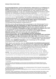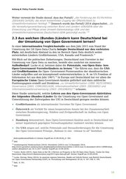 Anhang B: Policy-Transfer Studie Kontaktmöglichkeiten und Erreichbarkeiten elektronisch zur Verfügung zu stellen. Das EGovG ist dabei dem UIG untergeordnet, stellt Anforderungen wie Maschinenlesbarkeit und leichte Auffindbarkeit auf, aber enthielt bis 2017 keine 63 Veröffentlichungspflicht. In der 2017 beschlossenen Änderung des EGovG wurden Behörden der unmittelbaren Bundesverwaltung verpflichtet, „[…] unbearbeitete Daten, die sie zur Erfüllung ihrer öffentlich-rechtlichen Aufgaben erhoben haben oder durch Dritte in ihrem Auftrag haben erheben lassen, zum Datenabruf über öffentlich zugängliche Netze“ bereitzustellen. § 12a definiert allerdings eine Reihe von 64 Ausnahmetatbeständen, auch wird ein Anspruch auf die Bereitstellung dieser Daten nicht begründet. Die meisten Bundesländer haben eigene E-Government- Gesetze erlassen bzw. bereiten diese vor oder passen ihre 65 Verwaltungsverfahrensgesetze entsprechend an. 66 Mit Blick auf die offensichtlichen Überschneidungen in den Zielsetzungen ist es überraschend, dass die Aktivitäten zu Open Government und zum UIG in Deutschland bislang kaum integriert gedacht oder umgesetzt werden. So verweist der Nationale Aktionsplan zu Open Government im Rahmen der OGP in der Einleitung nur kurz auf die im UIG geregelten offenen Daten im Umweltbereich. Im Aktionsplan finden sich darüber hinaus keine weiteren Hinweise auf das UIG, auch nicht in den oben angeführten 15 Selbstverpflichtungen. Ebenso beschäftigen sich die Nationalen Umsetzungsberichte der Aarhus-Konvention für Deutschland 2013 und 2016 kaum mit Fragen zu Open Government oder Open Data. Der einzige Verweis sind die Ausführungen im 2016er Bericht zum GovData Datenportal mit dem Hinweis, dass dort „u.a. auch Daten zu Umwelt und Klima“ zu finden seien. Dies lässt darauf 67 schließen, dass mögliche Synergien in der Umsetzung von UIG und Open Government (noch) nicht gesehen werde. Dafür könnte auch sprechen, dass das elektronische Umweltinformationsportal „PortalU“, das Deutschland zur Umsetzung des UIG eingerichtet hatte, Ende 2014 abgeschaltet wurde. Die von der Bundesregierung im Rahmen der Nationalen E- Government Strategie (s. o.) in Auftrag gegebene Open-Government-Studie von Klessmann et al. hebt das PortalU noch als „weiteres Beispiel für eine ebenenübergreifende Bereitstellung staatlicher Daten und Informationen“ in „Kooperation der Umweltverwaltungen des Bundes und aller 16 Länder" hervor, welche „einen vollkommen geldleistungsfreien Zugriff auf über 3,6 Mio. Webseiten und über 500.000 Datenbankeinträge von über 450 öffentlichen Institutionen und Organisationen auf Grundlage des Umweltinformationsgesetzes" gewährleiste. 68 63 Klessmann, Denker, Schiederdecker, Schulz (2012): Open Government Data Deutschland. Eine Studie zu Open Government in Deutschland im Auftrag des Bundesministerium des Innern. Berlin, https://www.verwaltung- innovativ.de/SharedDocs/Publikationen/eGovernment/open_government_data_deutschland_langfassung.pdf? __blob=publicationFile&v=5 (letzter Zugriff am 25.09.2018), S. 54. 64 § 12a EGovG. 65 Informationen über die Regelungen zu E-Government der Bundesländer stellt folgende Webseite bereit: https://www.egovernment-computing.de/umsetzung-des-egovernment-gesetzes-a-543792/ (letzter Zugriff am 25.09.2018). 66 s. Kapitel 1.4. 67 Bundesministerium für Umwelt, Naturschutz, Bau und Reaktorsicherheit (2016): Nationaler Umsetzungsbericht der Aarhus-Konvention für Deutschland (2016), https://www.unece.org/fileadmin/DAM/env/pp/mop6/NIR_2017/2017_Germany_AC_NIR_DE_clean.pdf (letzter Zugriff am 25.09.2018), S. 20. 68 Klessmann, Denker, Schiederdecker, Schulz (2012): Open Government Data Deutschland. Eine Studie zu Open Government in Deutschland im Auftrag des Bundesministerium des Innern. Berlin, https://www.verwaltung- innovativ.de/SharedDocs/Publikationen/eGovernment/open_government_data_deutschland_langfassung.pdf? 15