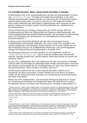 Anhang B: Policy-Transfer Studie 2.3.1 Großbritannien: Open- Government-Vorreiter in Europa Großbritannien wird in der wissenschaftlichen Literatur als internationaler Vorreiter und „Musterland in Europa“ für Open Government hervorgehoben. In der oben 75 zitierten internationalen Vergleichsstudie zur Umsetzung der G8 Open-Data-Charta 76 nimmt Großbritannien Platz 1 ein und erreicht 90 von 100 möglichen Punkten. Diese Studie begründet den Spitzenplatz Großbritanniens unter anderem mit dem großen Umfang, der Qualität und der Nutzerfreundlichkeit der veröffentlichten 77 Verwaltungsdaten. Mit der Einführung des Freedom of Information Act (FOIA) im Jahr 2000 hat Großbritannien das Recht der Öffentlichkeit auf Zugang zu allen Regierungs- und Verwaltungsinformationen rechtlich festgeschrieben, mit Ausnahme von persönlichen Daten von Individuen und Informationen von Geheimdiensten und Nationaler 78 Sicherheitsorganen. In Bezug auf die Nutzerfreundlichkeit setzt die Open-Government-License Großbritanniens internationale Maßstäbe. Die Lizenz wurde 2010 eingeführt und erlaubt unbegrenzte und kostenfreie Weiternutzung von etwa drei Vierteln der auf dem Datenportal data.gov.uk veröffentlichten Regierungs- und Verwaltungsdaten, 79 solange die Weiternutzung mit Quellenangaben versehen wird. Das Datenportal data.gov.uk wurde ebenfalls 2010 bereitgestellt. Es gilt als „Flaggschiff-Portal der Regierung“ und als eines der größten Open-Data-Portale 80 weltweit. Daneben besteht eine Vielzahl weiterer Open-Data-Portale auf lokaler und 81 nationaler Ebene. Im Jahr 2012 veröffentlichte das in der Regierung für Open Government zuständige Cabinett Office die Prinzipien für öffentliche Daten (Public Data Principles) und damit die Leitlinien und Standards für die Veröffentlichung von Open Data (unter anderem 82 Maschinenlesbarkeit, offene Formate und offene Lizenzen). Großbritannien gehört nicht nur zu den weltweit führenden Ländern in der Umsetzung von Open Government, sondern bemüht sich auch aktiver als andere Länder um die Integration seiner Strategien zur Umsetzung der Aarhus-Konvention und Open Government. Bereits das 2004 verabschiedete „Environmental Information Regulations“-Gesetz zur Umsetzung der Richtlinie des Europäischen Rates (RL 2003/4) war in seinen Grundsätzen mit dem vier Jahre zuvor beschlossenen „Freedom of Information Act“ 75 Smidak, Morrison, Sinner (2016): Großbritannien. Ein Musterland in Europa. In: Tobias Wangermann (Hg.): Open Data aus internationaler Perspektive. Länderberichte aus Brasilien, Frankreich, Großbritannien, Indien, Indonesien, Japan, Österreich, den Philippinen, Polen und den USA zum Stand von Open Data. Sankt Augustin, Berlin: Konrad- Adenauer-Stiftung e.V (Eine Veröffentlichung der Konrad-Adenauer-Stiftung e.V), S. 41–49, S. 41. 76 Castro, Korte (2015): Open Data in the G8. A Review on Progress in the G8 Open Data Charta. Center for Data Innovation, http://www2.datainnovation.org/2015-open-data-g8.pdf (letzter Zugriff am 25.09.2018), S. 5. 77 ibid. S. 26-28. 78 ibid. 79 ibid. 80 Smidak, Morrison, Sinner (2016): Großbritannien. Ein Musterland in Europa. In: Tobias Wangermann (Hg.): Open Data aus internationaler Perspektive. Länderberichte aus Brasilien, Frankreich, Großbritannien, Indien, Indonesien, Japan, Österreich, den Philippinen, Polen und den USA zum Stand von Open Data. Sankt Augustin, Berlin: Konrad- Adenauer-Stiftung e.V (Eine Veröffentlichung der Konrad-Adenauer-Stiftung e.V), S. 41–49, S. 43. 81 ibid. 82 Castro, Korte (2015): Open Data in the G8. A Review on Progress in the G8 Open Data Charta. Center for Data Innovation, http://www2.datainnovation.org/2015-open-data-g8.pdf (letzter Zugriff am 25.09.2018), S. 26-28. 17