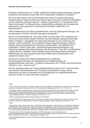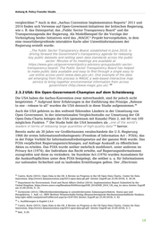 Anhang B: Policy-Transfer Studie 83 vergleichbar. Auch in den „Aarhus Convention Implementation Reports“ 2011 und 2014 finden sich Verweise auf Open-Goverment-Initiativen der britischen Regierung, wie z. B. das Datenportal, das „Public Sector Transparency Board“ und die Transparenzagenda der Regierung. Als Modellbeispiel für die Vorzüge der Verknüpfung beider Initiativen wird das „MAGIC“-Projekt hervorgehoben, in dem eine ressortübergreifende interaktive Karte aller Umweltinformationen der Regierung erstellt wurde: „The Public Sector Transparency Board, established in June 2010, is driving forward the Government’s transparency agenda for releasing key public datasets and setting open data standards across the public sector. Minutes of its meetings are available at https://www.gov.uk/government/policy-advisory-groups/public-sector- transparency-board). The Public Sector Transparency Board has helped to make public data available and easy to find through a single easy to use online access point (www.data.gov.uk). One example of the data set emerging from this process is MAGIC a web-based interactive map service to bring together environmental information from across government (http://www.magic.gov.uk).” 84 2.3.2 USA: Ein Open-Government-Champion auf dem Scheideweg Die USA haben die Aarhus-Konvention zwar mitverhandelt, sind ihr jedoch nicht 85 beigetreten . Aufgrund ihrer Erfahrungen in der Einführung des Prinzips „Release 86 to one - release to all“ wurden die USA dennoch in diese Studie aufgenommen. Auch die USA gehören zu den weltweit führenden Ländern in der Umsetzung von Open Government. In der internationalen Vergleichsstudie zur Umsetzung der G8 Open-Data-Charta belegen die USA (gemeinsam mit Kanada) Platz 2, mit 80 von 100 möglichen Punkten . Die Studie hebt die USA besonders als „one of the world’s 87 leaders in terms of releasing large quantities of high-quality data” hervor. 88 Bereits mehr als 30 Jahre vor Großbritannien verabschiedete die U.S.-Regierung 1966 ihr erstes Informationsfreiheitsgesetz (Freedom of Information Act – FOIA), das in der Folge Vorbild für Informationsfreiheitsgesetze auf der ganzen Welt wurde. Das FOIA verpflichtet Regierungseinrichtungen, auf Anfrage Auskunft zu öffentlichen Akten zu erteilen. Das FOIA wurde seither mehrfach modifiziert, unter anderem im Privacy Act (1974), der Individuen das Recht erteilte, auf Regierungsinformationen zuzugreifen und diese zu verändern. Im Sunshine Act (1976) wurden Ausnahmen für die Auskunftspflichten unter dem FOIA festgelegt, die seither u. a. für Informationen zur nationalen Sicherheit und zu laufenden Ermittlungen gelten. Der „Electronic 83 Castro, Korte (2015): Open Data in the G8. A Review on Progress in the G8 Open Data Charta. Center for Data Innovation, http://www2.datainnovation.org/2015-open-data-g8.pdf (letzter Zugriff am 25.09.2018), S. 26-28. 84 Department for Environment, Food and Rural Affairs (Defra) (2014): Implementation Report Submitted by the United Kingdom, https://www.unece.org/fileadmin/DAM/env/pp/NIR_2014/NIR_2014_UK_eng_trc.docx (letzter Zugriff am 25.09.2018), S. 14. 85 Zschiesche (2015): Öffentlichkeitsbeteiligung in umweltrelevanten Zulassungsverfahren. Status quo und Perspektiven. 1. Aufl. s.l.: BWV Berliner Wissenschafts-Verlag (Braunschweigische Rechtswissenschaftliche Studien), http://gbv.eblib.com/patron/FullRecord.aspx?p=4347302 (letzter Zugriff am 25.09.2018), S. 82 86 s. Ausführungen in Kapitel 2.4.4 87 Castro, Korte (2015): Open Data in the G8. A Review on Progress in the G8 Open Data Charta. Center for Data Innovation, http://www2.datainnovation.org/2015-open-data-g8.pdf (letzter Zugriff am 25.09.2018), S. 5 88 ibid., S.29. 18