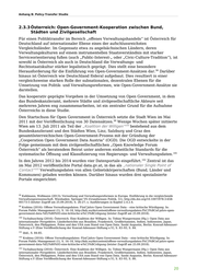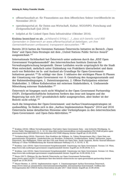 Anhang B: Policy-Transfer Studie ► offenerhaushalt.at: für Finanzdaten aus dem öffentlichen Sektor (veröffentlicht im November 2013) ► opendataportal.at: für Daten aus Wirtschaft, Kultur, NGO/NPO, Forschung und Zivilgesellschaft (Juli 2014) ► lodpilot.at für Linked Open Data Infrastruktur (Oktober 2014). Krabina bezeichnet es als „achtbare[n] Erfolg […] „dass sich bereits rund 900 Gemeinden in Österreich an www.offenerhaushalt.at beteiligen, um ihre Gemeindefinanzen umfassend, transparent darzustellen.“ 104 Bereits 2014 hatten die Vereinten Nationen Österreichs Initiative im Bereich „Open Data“ und Open-Data-Strategie mit dem „United Nations Public Service Award“ 105 ausgezeichnet. Internationale Sichtbarkeit hat Österreich unter anderem durch das „KDZ Open Government Vorgehensmodell“ des österreichischen Instituts Zentrum für Verwaltungsforschung hergestellt. Dieser Leitfaden wurde ursprünglich für die Stadt Wien entwickelt, mehrfach unter Einbindung von Praktikern überarbeitet und dann auch von Behörden im In- und Ausland als Grundlage für Open-Government- 106 Initiativen genutzt. Er schlägt vier (bzw. 5 inklusive der wichtigen Phase 0) Phasen der Umsetzung von Open Government vor: 0. Gestaltung des Ausgangszustands und der Rahmenbedingungen, 1. Datentransparenz, 2. Offene Partizipation externer Stakeholder, 3. Offene Kollaboration mit externen Stakeholdern, 4. Umfassende 107 Mitwirkung externer Stakeholder. Österreich ist hingegen noch nicht Mitglied in der Open Government Partnership (OGP). Zivilgesellschaftliche Initiativen fordern das zwar seit langem und die Regierung hat sich 2017 grundsätzlich dafür ausgesprochen, aber bisher ist der 108 Beitritt nicht erfolgt. Auch die Integration der Open-Government- und Aarhus-Umsetzungsstrategien ist ausbaufähig. So finden sich in den „Aarhus Implementation Reports“ 2014 und 2016 Österreichs keine detaillierten Hinweise oder Verknüpfungen zu den österreichischen 109 Open-Government- und Open-Data-Aktivitäten. 104 Krabina (2016): Offene Verwaltungsdaten: Fünf Jahre Open Government Data – eine kritische Würdigung. In: Forum Public Management (1), S. 16–18, http://kdz.eu/de/content/offene-verwaltungsdaten-f%C3%BCnf-jahre-open- government-data-%E2%80%93-eine-kritische-w%C3%BCrdigung (letzter Zugriff am 25.09.2018). 105 Tschabuschnig (2016): Österreich. Eine Koalition der Willigen. In: Tobias Wangermann (Hg.): Open Data aus internationaler Perspektive. Länderberichte aus Brasilien, Frankreich, Großbritannien, Indien, Indonesien, Japan, Österreich, den Philippinen, Polen und den USA zum Stand von Open Data. Sankt Augustin, Berlin: Konrad-Adenauer- Stiftung e.V (Eine Veröffentlichung der Konrad-Adenauer-Stiftung e.V), S. 83–93, S. 92. 106 Krabina; Lutz (2016): Open-Government-Vorgehensmodell. Umsetzung von Open Government. Version 3.0. Wien, http://www.kdz.eu/de/open-government-vorgehensmodell (letzter Zugriff am 25.09.2018), S. 5. 107 Krabina; Lutz (2016): Open-Government-Vorgehensmodell. Umsetzung von Open Government. Version 3.0. Wien, http://www.kdz.eu/de/open-government-vorgehensmodell (letzter Zugriff am 25.09.2018), S. 4. 108 Harm (2017): Plädoyer für den Beitritt Österreichs zur Open Government Partnership, https://www.open3.at/2017/11/plaedoyer-fuer-den-beitritt-oesterreichs-zur-open-government-partnership (letzter Zugriff am 25.09.2018). 109 Muner-Bretter, A. (2016): Implementation report. 4. Umsetzungsreport Aarhus Konvention Österreich, https://www.bmnt.gv.at/umwelt/eu-international/umweltpolitik_internat/aarhus-konvention/6.-Treffens-der- Vertragsstaaten-der-UNECE-Aarhus-Konvention-im-Jahr-2017-.html (letzter Zugriff am 25.09.2018). 21