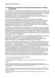 Anhang B: Policy-Transfer Studie 118 2012 auf einer Pressekonferenz, dass das Gesetz am Folgetag beschlossen werde. Es trat im Oktober 2012 in Kraft. Das Volksbegehren wurde daraufhin nicht mehr durchgeführt. Der Zweck des HmbTG ist es nach § 1 (1), dass Informationen (nicht nur Daten, s. dazu auch § 3 HmbTG) aller veröffentlichungspflichtigen Stellen „unmittelbar der Allgemeinheit zugänglich“ gemacht werden sollen. Das HmbTG verfolgt damit die steuerungspolitischen Ziele der Förderung der demokratischen Meinungs- und Willensbildung und der Ermöglichung der Kontrolle staatlichen Handelns. 119 Das Transparenzportal wurde 2014 veröffentlicht. Mittlerweile haben nach Informationen des Portals über 70 Behörden, Bezirke, öffentlicher Unternehmen 120 sowie Stellen der mittelbaren Staatsverwaltung Daten veröffentlicht. Die Zuständigkeit für die Umsetzung des Hamburger Transparenzgesetzes wurde an den „Hamburgischen Beauftragten für Datenschutz und Informationssicherheit“ 121 (HmbBfDI) vergeben. Maatsch und Schnabel erläutern in ihrem Gesetzeskommentar zum HmbTG, dass es in Hinsicht auf die aktive Veröffentlichung von Informationen auf dem Transparenzportal „weitgehend juristisches Neuland“ betrete, weil ein einklagbares Recht auf proaktive Veröffentlichung (§ 1 Abs. 2) - also ein „subjekives Recht“ für 122 jede Person - formuliert ist. Sie verweisen dabei darauf, dass die Veröffentlichungspflichten des UIG nicht so weit reichten, da sie „keine subjektiven Rechte auf Veröffentlichung“ verleihen. 123 Mit Blick auf eine mögliche Zusammenführung des HmbTG und des Hamburger UIG verweisen Maatsch und Schnabel darauf, dass diese noch nicht weit fortgeschritten 124 sei. Die erste Evaluation des HmbTG sieht die Integration mit dem Hamburger UIG 125 als eine Aufgabe für die Zukunft. Eine als Teil der Evaluation durchgeführte Umfrage ergab, dass es kaum Abgrenzungsschwierigkeiten zwischen dem HmbTG 126 und anderen Informationsfreiheitsgesetzen wie dem Hamburger UIG gab wobei ein Befragter darauf verwies, dass aufgrund der medialen „Überpräsenz des HmbTG … andere Gesetze wie z. B. das UIG in Vergessenheit“ geraten würden. 127 Die Evaluation zieht insgesamt eine positive Bilanz mit Blick auf die steigende Akzeptanz des HmbTG in den Behörden und der Öffentlichkeit, da es nur zu wenig 118 Herr, Müller, Engewald, Piesker, Ziekow (2017): Abschlussbericht zur Evaluation des Hamburgischen Transparenzgesetzes. Speyer, http://www.hamburg.de/contentblob/9260362/79c550cc44d699e99b7ea37dc1c1f796/ data/abschlussbericht-evaluation-hmbtg.pdf (letzter Zugriff am 25.09.2018), S. 1-2. 119 http://transparenz.hamburg.de/transparenzportal-hamburg/ (letzter Zugriff am 25.09.2018). 120 http://transparenz.hamburg.de/veroeffentlichende-stellen/ (letzter Zugriff am 25.09.2018). 121 s. Kapitel 2.4.1.4. 122 Maatsch, Schnabel (2015): Das Hamburgische Transparenzgesetz. Kommentar. Berlin, Brüssel: Lexxion Verlagsges., S. 3. 123 ibid. 124 ibid., S. 65, 107. 125 Herr, Müller, Engewald, Piesker, Ziekow (2017): Abschlussbericht zur Evaluation des Hamburgischen Transparenzgesetzes. Speyer, http://www.hamburg.de/contentblob/9260362/79c550cc44d699e99b7ea37dc1c1f796/ data/abschlussbericht-evaluation-hmbtg.pdf (letzter Zugriff am 25.09.2018), S. 250. 126 ibid., S. 211. 127 ibid., S. 235. 23
