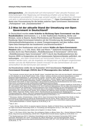 Anhang B: Policy-Transfer Studie mitzugestalten: „Die Gesellschaft soll Informationen über aktuelle Prozesse und 34 Entscheidungen ihrer Regierung und Verwaltung erhalten und auf Basis dieser Informationen grundsätzlich in die Lage versetzt werden, sich vergleichbar informiert und aktiv in demokratische Prozesse einzubringen. “ Open (Government) Data ist 35 damit eine Voraussetzung für die beiden anderen Open Government Dimensionen 36 „Partizipation“ und „Zusammenarbeit“. 2.2 Was ist der aktuelle Stand der Umsetzung von Open Government in Deutschland? In Deutschland wurden erste Schritte in Richtung Open Government von den Bundesländern unternommen, u. a. in den Stadtstaaten Hamburg, Berlin und 37 Bremen, sowie in Bayern, Baden-Württemberg und Rheinland-Pfalz. Insbesondere Hamburgs Open-Government-Initiative mit der Erweiterung des bestehenden Informationsfreiheitsgesetzes zu einem Transparenzgesetz und dem Aufbau eines 38 Open-Data-Datenportals hat bundesweit Leuchtturmcharakter. Neben den drei Stadtstaaten sind auch weitere Städte als Open-Government- Pioniere aktiv, u. a. Ulm, Bonn, Köln und Moers. Zahlreiche kommunale Initiativen 39 wurden durch das Pilotvorhaben „Modellkommunen E-Government“ (2014) bzw. „Modellkommunen Open Government" (2017) durch das Bundesministerium des Inneren (BMI) in Kooperation mit den kommunalen Spitzenverbänden gefördert, um aufzuzeigen, „wie Open Government auf kommunaler Ebene in der Verwaltung etabliert werden kann, wie die Angebote von Bürgerinnen und Bürgern angenommen werden und wie die Maßnahmen sowohl innovativ für das Gemeinwesen als auch wirtschaftlich für die Kommunen sein können.“ 40 Auf Bundesebene stellte die im September 2010 beschlossene Nationale E- Government-Strategie (NEGS) des IT Planungsrates den Auftakt der Open- 34 Die Vorstudie verweist darauf, dass der Begriff „Daten“ innerhalb Open Data nicht mit dem Begriff „Informationen“ im UIG identisch ist, da der Begriff „Daten“ reine „Fakten“ umfasse und diese erst durch Interpretation in einem konkreten Bedeutungskontext zu „Informationen“ werden. Vermerke, Akten, Studien, Berichte oder andere Fließtexte fallen entsprechend nicht unter den Begriff der „Daten“ und der Zugang zu diesen Informationen sei durch das IFG, UIG und VIG geregelt (Klessmann, Denker, Schiederdecker, Schulz (2012): Open Government Data Deutschland. Eine Studie zu Open Government in Deutschland im Auftrag des Bundesministerium des Innern. Berlin, https://www.verwaltung-innovativ.de/SharedDocs/Publikationen/eGovernment/ open_government_data_deutschland_langfassung.pdf?__blob=publicationFile&v=5 (letzter Zugriff am 25.09.2018), S. 54. Laut anderer Autor*innen wie Klessmann et al. (2012) sind auch Informationen Teil von Open (Government) Data. Auch die Evaluation des Hamburger Transparenzgesetzes fasst sowohl Rohdaten als auch Informationen unter Open Government Data: „Das Ziel von Open Government Data ist die proaktive Veröffentlichung von Rohdaten und Informationen der Verwaltung eines Staates, die im Rahmen der täglichen Arbeit entstehen und bearbeitet werden.“ (Herr, Müller, Engewald, Piesker, Ziekow (2017): Abschlussbericht zur Evaluation des Hamburgischen Transparenzgesetzes. Speyer, http://www.hamburg.de/contentblob/9260362/79c550cc44d699e99b7ea37dc1c1f796/ data/abschlussbericht-evaluation-hmbtg.pdf (letzter Zugriff am 25.09.2018), S. 1). 35 Klessmann, Denker, Schiederdecker, Schulz (2012): Open Government Data Deutschland. Eine Studie zu Open Government in Deutschland im Auftrag des Bundesministerium des Innern. Berlin, https://www.verwaltung- innovativ.de/SharedDocs/Publikationen/eGovernment/open_government_data_deutschland_langfassung.pdf? __blob=publicationFile&v=5 (letzter Zugriff am 25.09.2018), S. 26. 36 ibid, S. 26 f. 37 Lucke, Herzog, Heise (2014): In unserem eigenen Interesse. Replik auf Göttrik Wewer zum Beitritt Deutschlands zur Open Government Partnership (OGP), In: Verwaltung und Management 20 (4), S. 187–198, S. 192. 38 ausführliche Informationen dazu finden sich in Kapitel 2.3.4 dieser Studie. 39 ibid., S. 195; Kuzev (2016): Open Data. Die wichtigsten Fakten zu offenen Daten. Hg. v. Konrad Adenauer Stiftung. Berlin, http://www.kas.de/wf/doc/kas_44530-544-1-30.pdf?160315122244 (letzter Zugriff am 25.09.2018), S. 6 40 Die Bundesregierung (2017): Teilnahme Deutschlands an der Open Government Partnership (OGP). Erster Nationaler Aktionsplan 2017-2019. Grundsteine für offenes Regierungs- und Verwaltungshandeln. Berlin, https://www.opengovpartnership.org/sites/default/files/Germany_NAP_2017-2019_DE.pdf (letzter Zugriff am 25.09.2018), S. 7-8. 11