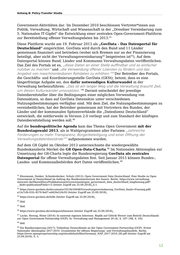 Anhang B: Policy-Transfer Studie Government-Aktivitäten dar. Im Dezember 2010 beschlossen Vertreter*innen aus Politik, Verwaltung, Wirtschaft und Wissenschaft in der „Dresdner Vereinbarung zum 5. Nationalen IT-Gipfel“ die Entwicklung einer zentralen Open-Government-Plattform 41 zur Bereitstellung offener Verwaltungsdaten bis 2013. Diese Plattform wurde am 19. Februar 2013 als „GovData - Das Datenportal für Deutschland“ eingerichtet. GovData wird durch den Bund und 11 Länder gemeinsam finanziert und betrieben (wobei sich Bremen nur an der Finanzierung 42 43 beteiligt, aber nicht der Verwaltungsvereinbarung beigetreten ist ). Auf dem Datenportal können Bund, Länder und Kommunen Verwaltungsdaten veröffentlichen. Das Ziel des Portals ist es, „diese Daten an einer Stelle auffindbar und so einfacher nutzbar zu machen“ und „die Verwendung offener Lizenzen zu fördern und das Angebot von maschinenlesbaren Rohdaten zu erhöhen.“ Der Betreiber des Portals, 44 die Geschäfts- und Koordinierungsstelle GovData (GKSt), betont, dass es eine längerfristige Aufgabe sei, den dafür notwendigen Kulturwandel in der Verwaltung herbeizuführen: „Das ist ein langer Weg und die Verwaltung braucht Zeit, um diesen Kulturwandel umzusetzen.“ Derzeit entscheidet der jeweilige 45 Datenbereitsteller über die Bedingungen einer möglichen Verwendung von Datensätzen, so dass auf GovData Datensätze unter verschiedenen Nutzungsbestimmungen verfügbar sind. Mit dem Ziel, die Nutzungsbestimmungen zu vereinheitlichen, hat der Betreiber gemeinsam mit Vertretern des Bundes, der Länder und der kommunalen Spitzenverbände die „Datenlizenz Deutschland“ entwickelt, die mittlerweile in Version 2.0 vorliegt und zum Standard der künftigen 46 Datenbereitstellung werden soll. Auf die bundespolitische Agenda kam das Thema Open Government mit der Bundestagswahl 2013, als in Wahlprogrammen aller Parteien „zahlreiche Forderungen zu mehr Transparenz, Bürgerbeteiligung und einer Öffnung der Verwaltungsdatenbestände“ aufgenommen wurden. 47 Auf dem G8 Gipfel im Oktober 2013 unterzeichnete die wiedergewählte Bundeskanzlerin Merkel die G8 Open-Data-Charta. Im Nationalen Aktionsplan zur 48 Umsetzung der G8-Charta legte die Bundesregierung GovData als zentrales Datenportal für offene Verwaltungsdaten fest. Seit Januar 2015 können Bundes-, 49 Landes- und Kommunalbehörden dort Daten veröffentlichen. 41 Klessmann, Denker, Schiederdecker, Schulz (2012): Open Government Data Deutschland. Eine Studie zu Open Government in Deutschland im Auftrag des Bundesministerium des Innern. Berlin, https://www.verwaltung- innovativ.de/SharedDocs/Publikationen/eGovernment/open_government_data_deutschland_langfassung.pdf? __blob=publicationFile&v=5 (letzter Zugriff am 25.09.2018), S.1. 42 https://www.govdata.de/documents/10156/18448/Verwaltungsvereinbarung_GovData_finale+Fassung.pdf/ a12e7cfb-91fc-4570-9a07-ed420e524c93 (letzter Zugriff am 25.09.2018). 43 https://www.govdata.de/hilfe (letzter Zugriff am 25.09.2018). 44 Ibid. 45 Ibid. 46 https://www.govdata.de/web/guest/lizenzen (letzter Zugriff am 25.09.2018). 47 Lucke, Herzog, Heise (2014): In unserem eigenen Interesse. Replik auf Göttrik Wewer zum Beitritt Deutschlands zur Open Government Partnership (OGP), In: Verwaltung und Management 20 (4), S. 187–198, S. 192. 48 ibid. 49 Die Bundesregierung (2017): Teilnahme Deutschlands an der Open Government Partnership (OGP). Erster Nationaler Aktionsplan 2017-2019. Grundsteine für offenes Regierungs- und Verwaltungshandeln. Berlin, https://www.opengovpartnership.org/sites/default/files/Germany_NAP_2017-2019_DE.pdf (letzter Zugriff am 25.09.2018), S. 5. 12