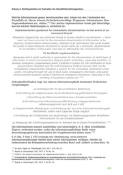 Anhang A: Rechtsgutachten zur Evaluation des Umweltinformationsgesetzes Welche Informationen genau bereitzustellen sind, hängt von den Umständen des Einzelfalls ab. Hierzu können Sicherheitsratschläge, Prognosen, Informationen über 1254 Gegenmaßnahmen etc. zählen. Der Aarhus Implementation Guide gibt Ratschläge, wie bei solchen Bedrohungen zu verfahren ist: “Implementation guidance for immediate dissemination in the event of an imminent threat Obligation triggered by any imminent threat to human health or environment — harm need not have occurred for the immediate dissemination of information to be required./ Dissemination without delay./ Release of all information that could enable the public to take measures to prevent or lessen harm./As a minimum, dissemination to all members of the public who may be affected by the imminent threat. To facilitate implementation: Designate which public authority is responsible for the dissemination of which type of information in which circumstances; Require public authorities, especially localities, to develop emergency preparedness plans; Establish a system for the notification of local governments, hospitals and fire and emergency medical services that can be immediately implemented; Establish a system for the immediate notification of the public, including through the use of local radio, newspapers, television, and public announcement systems.Conduct training for emergency personnel, especially in the handling of hazardous substances.” 1255 Schrader/Kroll haben bzgl. der aktiven Informationspflicht bestimmte Prüfschritte vorgeschlagen: „a) Anhaltspunkte für die unmittelbare Bedrohung b) Ermittlung der möglicherweise durch die Bedrohung gefährdeten Rechtsgüter c) Ermittlung der Wahrscheinlichkeit eines Schadenseintrittes d) Ermittlung einer Informationsveröffentlichung entgegenstehenden Ablehnungsgründe nach §§ 8 und 9 UIG e) Gegebenenfalls Mitteilung an und Anhörung der von einer Informationsweitergabe Betroffenen, sofern nach Lage der Dinge möglich. f) Ermittlung der Erheblichkeit von bestimmten, mit Ablehnungsgründen behafteten Informationen für die Schadensabwehr g) Abwägung der Ermittlungsergebnisse im Rahmen der Je-Desto-Formel/Relation.“ 1256 Die Informationen müssen unmittelbar und unverzüglich, d. h. ohne schuldhaftes Zögern, verbreitet werden, wobei die informationspflichtige Stelle einen 1257 Beurteilungsspielraum hinsichtlich der Vorgehensweise haben muss. § 10 Abs. 5 Satz 2 UIG verlangt eine Abstimmung, wenn mehrere informationspflichtige Stellen über solche Informationen verfügen. Hierbei ist insbesondere die Kompetenzverteilung zwischen Bund und Ländern zu beachten. So 1253 So auch: Engel, in: Götze/Engel, UIG, 2017, § 10, Rn. 53. 1254 Engel, in: Götze/Engel, UIG, 2017, § 10, Rn. 54. 1255 UNECE, The Aarhus Convention, An Implementation Guide, 2. Aufl. 2014, S. 99. 1256 Schrader/Kroll, Risikokommunikation im Anwendungsbereich der Störfall-Verordnung, Teil I, Gutachten zur Kommunikation gemäß Umweltinformationsgesetz, Texte des Umweltbundesamts 33/07, S. 144. 1257 Engel, in: Götze/Engel, UIG, 2017, § 10, Rn. 55. 295