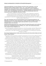 Anhang A: Rechtsgutachten zur Evaluation des Umweltinformationsgesetzes Informationspflichten zwischen Bürgern sind dort nicht vorgesehen; auch die Pflichten privater Stellen gemäß § 2 Abs. 1 Nr. 2 UIG stellen insoweit keine Ausnahme dar, denn diese sind nur informationspflichtig, soweit sie öffentliche 1286 Aufgaben mit Umweltbezug wahrnehmen. Dagegen enthält die Aarhus-Konvention in Art. 5 Abs. 6 eine Regelung, nach der Betreiber die Öffentlichkeit über ihre umweltrelevanten Tätigkeiten informieren sollen: „Jede Vertragspartei ermutigt die Betreiber, deren Tätigkeiten erhebliche Auswirkungen auf die Umwelt haben, die Öffentlichkeit regelmäßig über die Umweltauswirkungen ihrer Tätigkeiten und Produkte zu informieren, soweit angemessen im Rahmen freiwilliger Systeme wie des Umweltzeichens, des Öko-Audits oder sonstiger Maßnahmen.“ Dies steht allerdings nicht im Zusammenhang mit den Informationspflichten der Behörden im Sinne der Aarhus-Konvention, sondern betrifft freiwillige Systeme wie Umweltzeichen (z. B. der Blaue Engel) oder das EMAS. Für das UIG ist diese Maßgabe daher nicht relevant. Weiterentwicklungspotential der ersten Säule der Aarhus-Konvention wird zudem im Bereich der Produktinformationen gesehen. Art. 5 Abs. 8 der Aarhus-Konvention sieht entsprechende Maßgaben vor: „Jede Vertragspartei entwickelt Strukturen, um sicherzustellen, daß der Öffentlichkeit ausreichende Produktinformationen zur Verfügung gestellt werden, welche die Verbraucher in die Lage versetzen, eine sachkundige, am Umweltschutz orientierte Auswahl zu treffen.“ Der Aarhus-Implementation Guide und die Ausschüsse der Konvention haben sich mit diesem Thema befasst: “Paragraph 8 requires Parties to develop mechanisms to ensure that sufficient product information is available to the public. The information must be made available — whether by Parties, producers, or sellers — in a manner that enables consumers to make informed environmental choices. This is a potentially far-reaching provision that could be further developed by Governments when implementing it. Consumer protection has been a core EU policy since 1993. To this end, the EU has developed a body of consumer law, including provisions on access to information, public participation and access to justice. One common tool for providing consumer information is eco-labelling (see article 5, para. 6). Eco-labels can contain information concerning the origins of the product and its contents, the effects of the product’s contents, the impact of the product on health or the environment during and after use and consumer guidelines for using the product in as environmentally friendly a manner as possible. Mechanisms for product information may be established through codes of conduct that ensure consistency and reliability. In addition, public authorities that embrace the ISO 14021 standard on self-declared environmental claims can also translate this standard into practical guidelines that can be used by both manufacturers in avoiding misleading advertising and by their own review bodies in the adjudication of complaints. Other implementation options are discussed below. Implementation options for product information Countries have developed a variety of mechanisms to ensure that sufficient product information is available to the public. These include both voluntary and regulatory mechanisms, including: 1286 S. oben unter 2.2.2.2. 303