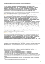 Anhang A: Rechtsgutachten zur Evaluation des Umweltinformationsgesetzes Ob sich auch ein allgemeiner Auslegungsgrundsatz „im Zweifel für den Informationszugang“ aus § 1 Abs. 1 UIG entnehmen lässt, ist streitig. Hierauf 21 kommt es aber letztlich nicht an, denn es gilt zumindest ein Grundsatz der informationsfreundlichen Auslegung, der aus der oben beschriebenen weiten Interpretation der anspruchseröffnenden Regelungen und Begriffe folgt. Hinzu kommt ein Gebot der richtlinienkonformen Auslegung, wobei insbesondere 22 auch die Erwägungsgründe der UIRL heranzuziehen sind. 2.1.1.2.4 Wenig substanzielle Zielbestimmung des § 1 Abs. 1 UIG Es ist unschwer zu erkennen, dass die oben zitierte Zielbestimmung der UIRL ausführlicher ist als die des UIG, so dass § 1 UIG zu Recht als „ inhaltlich wenig substanziell“ bezeichnet wird. Es wird lediglich bezweckt, „einen rechtlichen 23 Rahmen … zu schaffen“. In der vorherigen Fassung des UIG wurde dagegen davon gesprochen, den freien Zugang zu und die aktive Verbreitung von Umweltinformationen „zu gewährleisten“. Die Zielbestimmung ist daher mehr noch 24 als die Vorfassung auslegungsbedürftig. Ihre Auslegung muss wie beschrieben im Lichte der UIRL und der Aarhus-Konvention erfolgen. Das UIG setzt aufgrund der doppelten, sowohl unions- wie völkerrechtlichen Verpflichtung, beide Vorgaben in nationales Recht um. Es kann daher trotz des unklaren Wortlauts in § 1 Abs. 1 UIG nicht nur rein formal bezweckt sein, lediglich einen Rahmen zu setzen, sondern der Zielsetzung kommt auch eine inhaltliche, bei der Interpretation zugrunde zu legende Dimension zu. Alles andere würde den Grundgedanken der genannten Vorgaben widersprechen. Im Übrigen enthalten sowohl § 3 Abs. 1 wie auch § 10 Abs. 1 UIG 25 unmissverständliche Ansprüche bzw. Pflichten. 2.1.1.2.5 Weiterverwendung von Informationen Die Weiterverwendung von Informationen wird in § 1 Abs. 1 UIG nicht als Ziel des Gesetzes genannt. Was nach der Herausgabe der Information mit den jeweiligen 26 Daten geschieht, wird vom Regelungsbereich des UIG nicht erfasst. Vielmehr gilt insoweit das auf der Weiterverwendungsrichtlinie 2003/98/EG beruhende Informationsweiterverwendungsgesetz (IWG). Dieses Gesetz gilt nach § 1 Abs. 1 IWG „für die Weiterverwendung von bei öffentlichen Stellen vorhandenen Informationen, insbesondere zur Bereitstellung von Produkten und Dienstleistungen der digitalen Wirtschaft.“ Damit gilt es für solche Informationen, die bereits zugänglich gemacht worden sind. Beschränkungen der weiteren Verwendung von Informationen lassen sich daher 21 Dafür: Schrader, in: Schlacke/Schrader/Bunge, Aarhus-Handbuch, 2. Aufl. 2019, § 1 Rn. 82; Schomerus/Schrader/Wegener , UIG, 2. Aufl. 2002, § 1 Rn. 4; dagegen: Reidt/Schiller, UIG, § 1 Rn. 16, in: Landmann/Rohmer, UmweltR, 85. EL Dezember 2017. 22 Reidt/Schiller, UIG § 1 Rn. 5, in: Landmann/Rohmer, UmweltR, 85. EL Dezember 2017. 23 Reidt/Schiller, UIG § 1 Rn. 5, in: Landmann/Rohmer, UmweltR, 85. EL Dezember 2017. 24 So § 1 UIG vom 08.07.1994, BGBl. I S. 1490 i.d.F. d. Bekanntmachung vom 23.08.2001, BGBl. I S. 2218; die Zielbestimmung lautete: „§ 1 Zweck des Gesetzes Zweck dieses Gesetzes ist es, den freien Zugang zu den bei den Behörden vorhandenen Informationen über die Umwelt sowie die Verbreitung dieser Informationen zu gewährleisten und die grundlegenden Voraussetzungen festzulegen, unter denen derartige Informationen zugänglich gemacht werden.“ 25 Mit ähnlicher Argumentation: Reidt/Schiller, UIG § 1 Rn. 3, in: Landmann/Rohmer, UmweltR, 85. EL Dezember 2017. 26 Sydow, Informationsgesetzbuch häppchenweise, NVwZ 2008, 481, 484. 12