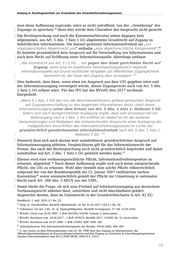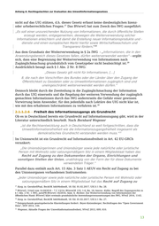 Anhang A: Rechtsgutachten zur Evaluation des Umweltinformationsgesetzes man diese Auffassung zugrunde, wäre es nicht zutreffend, von der „ Gewährung“ des 39 Zugangs zu sprechen, denn dies würde dem Charakter des Anspruchs nicht gerecht. Die Rechtsprechung und auch die Kommentarliteratur sehen dagegen kein allgemeines, aus Art. 5 Abs. 1 Satz 1 GG abgeleitetes Grundrecht auf Zugang zu behördlichen Informationen. Die hierauf gestützte Informationsfreiheit sei „ ein staatsgerichtetes Abwehrrecht und“ enthalte „eine objektivrechtliche Komponente“. 40 Es bestehe grundsätzlich kein Anspruch auf die Verschaffung von Informationen und auch kein Recht auf Eröffnung einer Informationsquelle. Allerdings umfasse „das Grundrecht aus Art. 5 I 1 GG … ein gegen den Staat gerichtetes Recht auf Zugang, wenn eine im staatlichen Verantwortungsbereich liegende Informationsquelle auf Grund rechtlicher Vorgaben zur öffentlichen Zugänglichkeit bestimmt ist, der Staat den Zugang aber verweigert.“ 41 Dies bedeutet, dass dann, wenn etwa ein Anspruch aus dem UIG gegeben wäre und der Informationszugang verweigert würde, dieses Zugangsrecht auch von Art. 5 Abs. 1 Satz 1 GG erfasst wäre. Für das IFG hat das BVerfG dies 2017 nochmals klargestellt. „Wenn § 1 Abs. 1 IFG den von der Beschwerdeführerin geltend gemachten Anspruch auf Zugangsverschaffung zu den begehrten Informationen deckt, steht dieser Informationszugang unter dem Schutz von Art. 5 Abs. 1 Satz 1, Halbsatz 2 GG. Sofern sich nach fachgerichtlicher Auslegung ergibt, dass vom Grundsatz her ein Aktenzugang nach § 1 Abs. 1 IFG eröffnet ist, bedarf es für die weiteren Voraussetzungen und Maßgaben des entsprechenden Anspruchs einer Auslegung der maßgeblichen Vorschriften des Informationsfreiheitsgesetzes im Lichte der grundrechtlich gewährleisteten Informationsfreiheit nach Art. 5 Abs. 1 Satz 1, Halbsatz 2 GG..“ 42 Dennoch lässt sich auch daraus kein unmittelbarer grundrechtlicher Anspruch auf Informationszugang ableiten. Vergleichbares gilt für das Informationsrecht der Presse, das nach der Rechtsprechung auch nicht grundrechtlich begründet und damit 43 unmittelbar auf Art. 5 Abs. 1 Satz 1 GG gestützt werden kann. Ebenso wird eine verfassungsrechtliche Pflicht, Informationsfreiheitsgesetze zu 44 erlassen, abgelehnt. Nach dieser Auffassung ergibt sich auch keine entsprechende Pflicht, ein UIG zu erlassen. Wohl aber besteht eine solche Pflicht völkerrechtlich aufgrund der von der Bundesrepublik am 15. Januar 2007 ratifizierten Aarhus- 45 Konvention sowie unionsrechtlich gemäß der Pflicht zur Umsetzung in nationales Recht nach Art. 288 Abs. 3 AEUV aus der UIRL. Damit bleibt die Frage, ob sich eine Freiheit auf Informationszugang aus deutschem Verfassungsrecht ableiten lässt, umstritten und nicht abschließend geklärt. Angesichts dessen, dass im Unionsrecht in der Grundrechtecharta in Art. 42 EU- Handbuch, 2. Aufl. 2019, § 1 Rn. 33. 39 Karg, in: Gersdorf/Paal, BeckOK InfoMedienR, 18. Ed. 01.02.2017, UIG § 1 Rn. 20. 40 Schemmer, GG Art. 5 Rn. 32, in: Epping/Hillgruber, BeckOK Grundgesetz, 37. Ed. 15.05.2018. 41 BVerfG, Urteil vom 24.01.2001 –1 BvR 2623/95, 622/99, Leitsatz 2, beck-online. 42 BVerfG, Beschluss vom. 20.06.2017 – 1 BvR 1978/13, BeckRS 2017, 116390, Rz. 33, beck-online. 43 BVerfG, Beschluss vom 20.07.1988 - 1 BvR 155/85, NJW 1989, 382. 44 Schmitz/Jastrow, Das Informationsfreiheitsgesetz des Bundes, NVwZ 2005, 984, 985. 45 S. das Gesetz zu dem Übereinkommen vom 25. 06. 1998 über den Zugang zu Informationen, die Öffentlichkeitsbeteiligung an Entscheidungsverfahren und den Zugang zu Gerichten in Umweltangelegenheiten (Aarhus-Übereinkommen) vom 09.12.2006 (BGBl. 2006 II S. 1251). 15