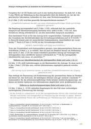 Anhang A: Rechtsgutachten zur Evaluation des Umweltinformationsgesetzes Vorgaben für § 4 UIG finden sich auch in der Aarhus-Konvention. So sieht Art. 4 Abs. 5 eine Pflicht zur Mitteilung an den Antragsteller über die Behörde vor, bei der die gewünschte Information vorhanden ist, bzw. eine Weiterleitungspflicht. 435 In § 4 Abs. 1 UIG wird das generelle Antragserfordernis normiert. „Umweltinformationen werden von einer informationspflichtigen Stelle auf Antrag zugänglich gemacht.“ Die Regelung korrespondiert mit § 3 Abs. 1 UIG: während dort der materielle Anspruch auf Informationszugang bestimmt wird, sieht § 4 Abs. 1 UIG vor, dass formell ein Antrag erforderlich ist, um den materiellen Anspruch auszulösen. Eine bestimmte Form ist für den Antrag nicht vorgeschrieben. Vielmehr gilt insoweit 436 der Grundsatz der Nichtförmlichkeit des Verwaltungsverfahrens nach § 10 VwVfG. In Betracht kommt jede Art menschlicher Kommunikation, einschließlich der social 437 media. Nach § 10 Satz 2 VwVfG ist das Verwaltungsverfahren „einfach, zweckmäßig und zügig durchzuführen.“ Trotz der Formfreiheit wird Antragstellern geraten, eine dokumentierbare Form wie Schriftform, E-Mail o. ä. zu wählen. Dies ist auch im Hinblick darauf von Bedeutung, dass nach § 5 Abs. 2 UIG bei einem schriftlich gestellten Antrag auf Verlangen des 438 Antragstellers eine schriftliche Antwort erforderlich ist. Ob der Antragsteller 439 identifizierbar sein muss, ist umstritten. Näheres zur Identifizierbarkeit des Antragstellers findet sich unter 2.4.2.2. § 4 Abs. 2 UIG stellt Anforderungen an die Bestimmtheit des Antrags. Es muss nach § 4 Abs. 2 Satz 1 UIG klar sein, welche Informationen zugänglich gemacht werden sollen. „Der Antrag muss erkennen lassen, zu welchen Umweltinformationen der Zugang gewünscht wird.“ Dies bedingt die Benennung und Konkretisierung der gewünschten Daten im Hinblick 440 auf deren Art, den Zeitraum, die beteiligten Akteure und ggf. weiterer Umstände. Insbesondere für die informationspflichtige Stelle können Ausforschungsanträge, mit denen ein breites Spektrum von Informationen abgefordert wird, problematisch sein. Näheres zu Ausforschungsanträgen findet sich unter 2.4.2.1. § 4 Abs. 2 Sätze 2 – 4 UIG enthalten Regelungen für den Fall einer notwendigen nachträglichen Präzisierung des Antrags: „Ist der Antrag zu unbestimmt, so ist der antragstellenden Person dies innerhalb eines Monats mitzuteilen und Gelegenheit zur Präzisierung des Antrags zu geben. Kommt die antragstellende Person der Aufforderung zur Präzisierung nach, beginnt der Lauf 435 Karg, in: Gersdorf/Paal, BeckOK InfoMedienR, 18. Ed. 01.02.2017, UIG § 4 Rn. 2; Reidt/Schiller, in: Landmann/Rohmer, UmweltR, 85. EL Dezember 2017, UIG § 4 Rn. 3. 436 Karg, in: Gersdorf/Paal, BeckOK InfoMedienR, 18. Ed. 01.02.2017, UIG § 4 Rn. 3. 437 Karg, in: Gersdorf/Paal, BeckOK InfoMedienR, 18. Ed. 01.02.2017, UIG § 4 Rn. 3. 438 Karg, in: Gersdorf/Paal, BeckOK InfoMedienR, 18. Ed. 01.02.2017, UIG § 4 Rn. 3.1. 439 Dafür: Reidt/Schiller, in: Landmann/Rohmer, UmweltR, 85. EL Dezember 2017, UIG § 4 Rn. 5; a.A. Karg, in: Gersdorf/Paal, BeckOK InfoMedienR, 18. Ed. 01.02.2017, UIG § 4 Rn. 5. 440 Karg, in: Gersdorf/Paal, BeckOK InfoMedienR, 18. Ed. 01.02.2017, UIG § 4 Rn. 7; vgl. zur notwendigen Bestimmtheit von Auskunftsbegehren der Presse BVerwG, Beschluss vom 26.10.2017 – 6 VR 1/17 – juris, Rn. 9. 105